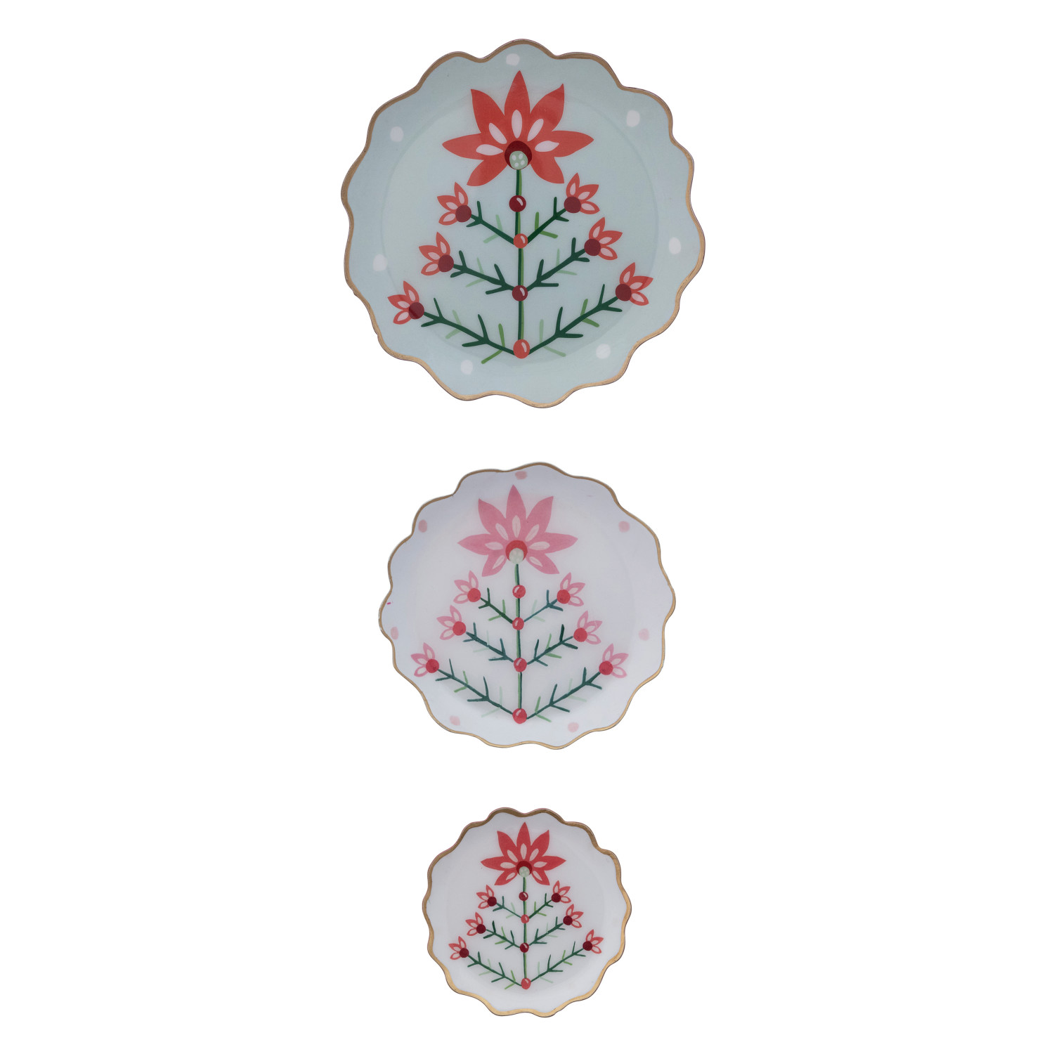 Catalog Name: 8-1/4" Round, 6" Round & 4" Round Enameled Metal Scalloped Trays w/ Holiday Botanicals & Gold Edges, Multi Color, Set of 3 ©