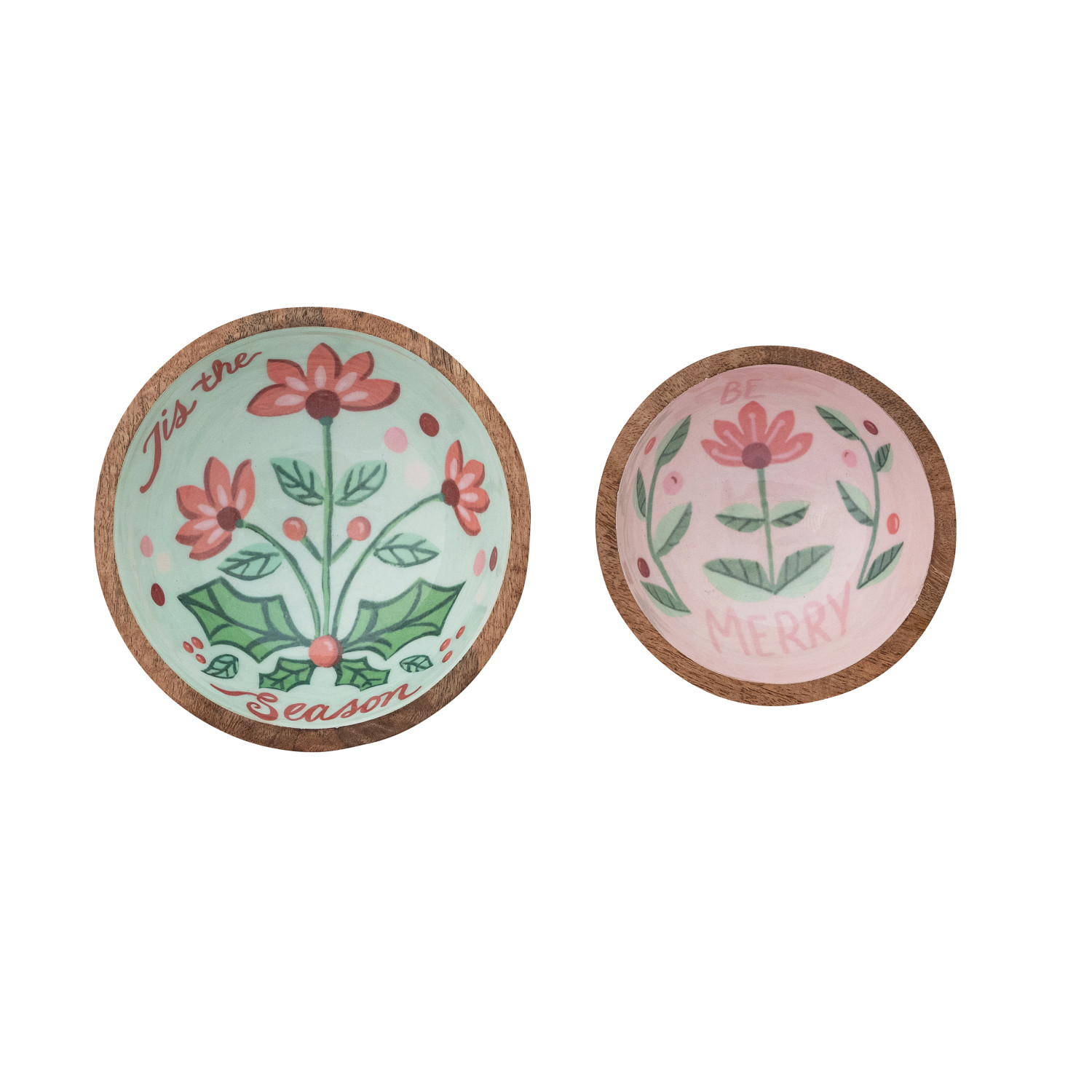Enameled Mango Wood Bowls with Holiday Botanicals & Saying, Set of 2 ©
