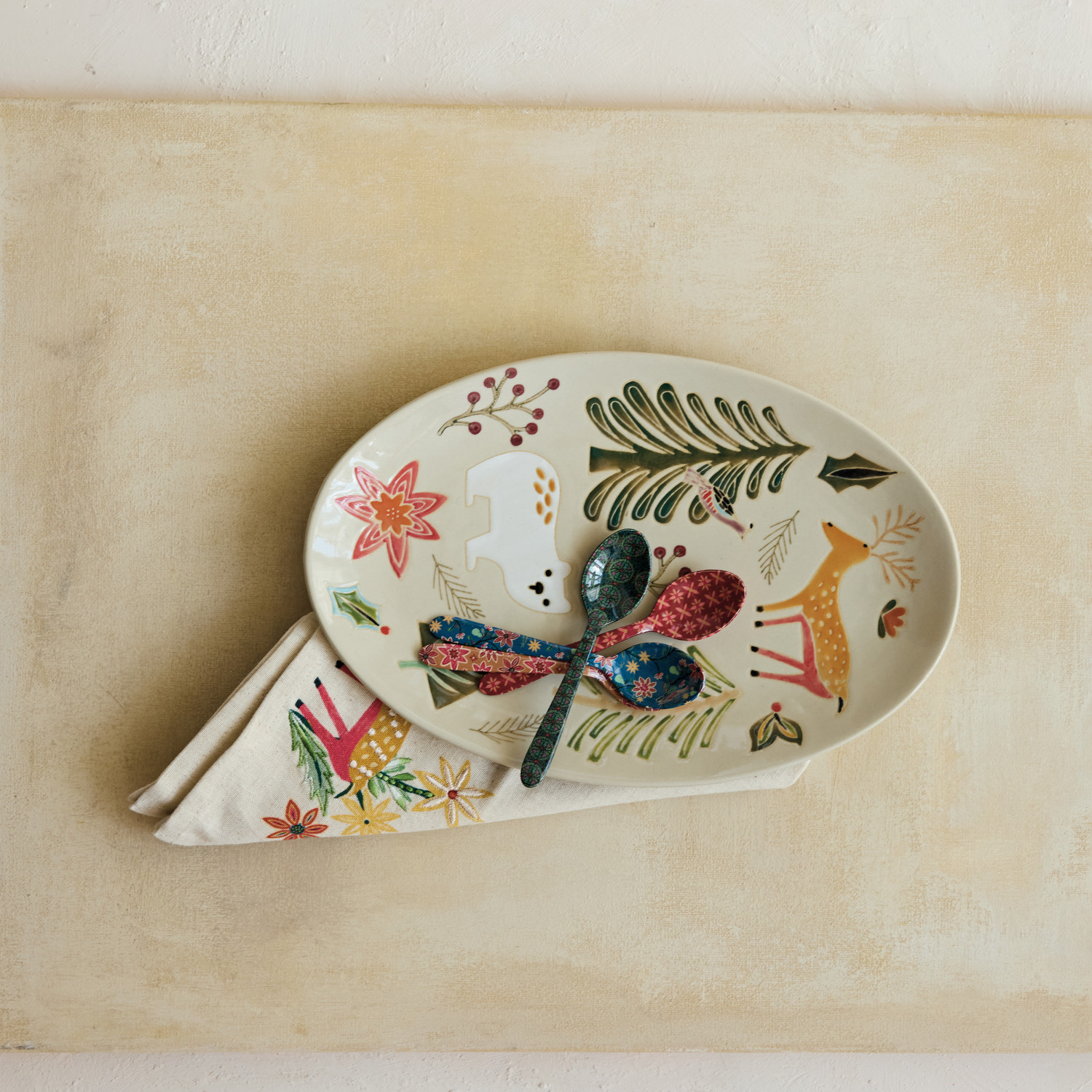 Catalog Name: 12-1/4"L x 8"W Oval Hand-Painted Stoneware Platter w/ Wax Relief Animals & Seasonal Botanicals, Multi Color ©