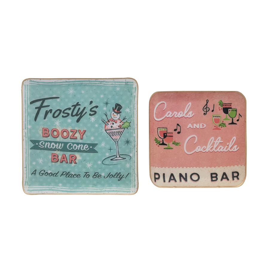 Catalog Name: 8-1/2" Square & 7" Square Enameled Metal Trays w/ Holiday Bar Images & Sayings, Multi Color, Set of 2 ©