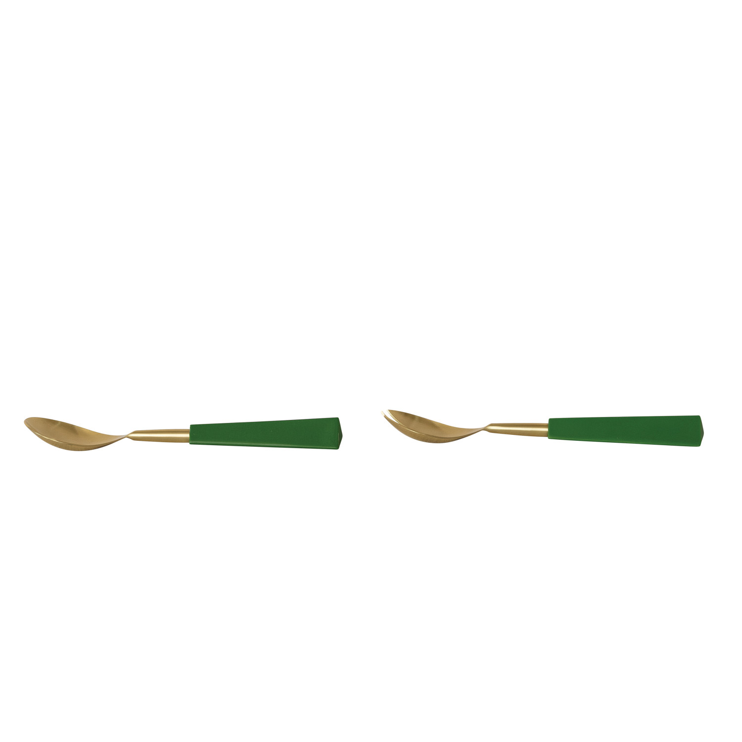 Catalog Name: 10-1/2"L Stainless Steel Salad Servers w/ Resin Handles, Gold Finish & Green, Set of 2 in Printed Drawstring Bag