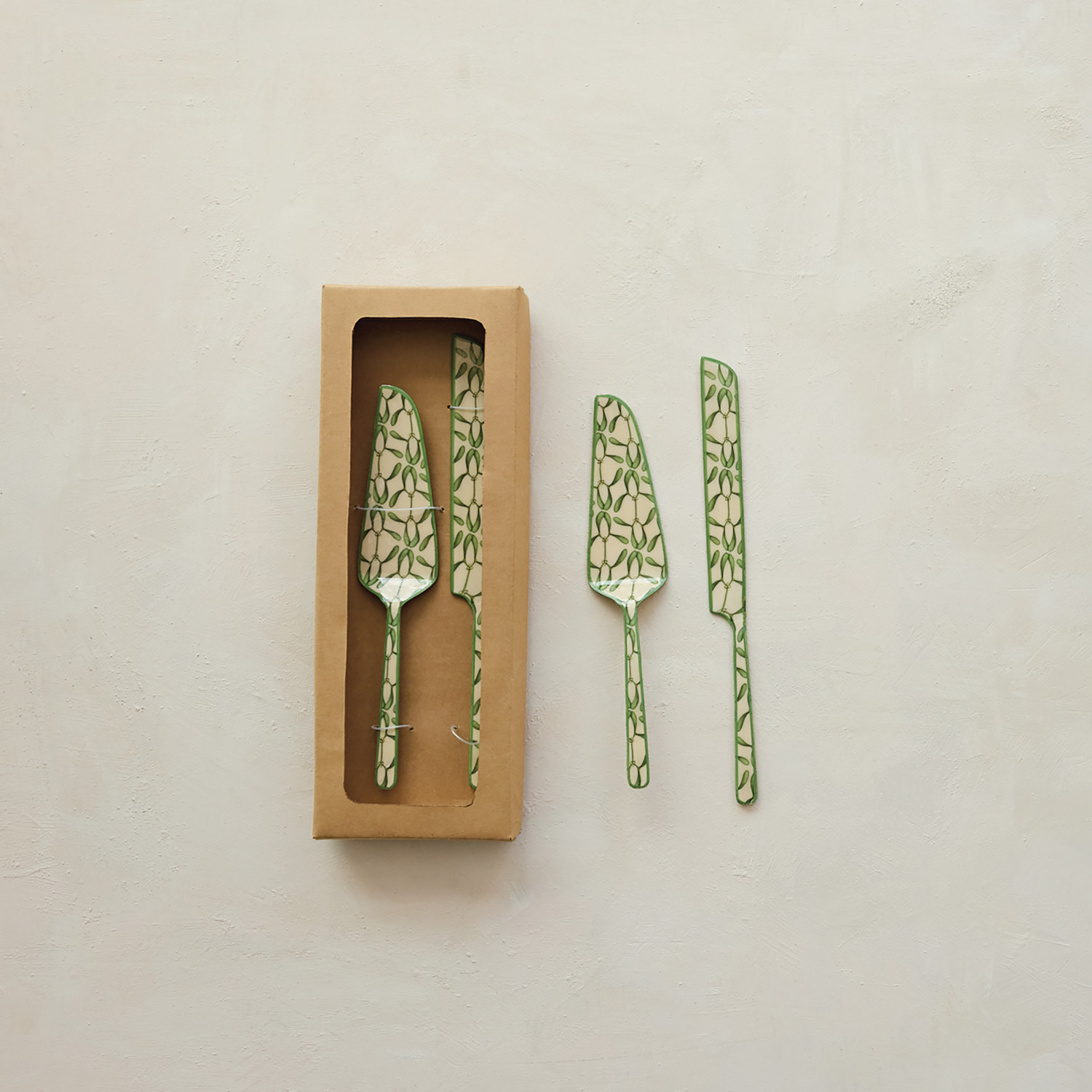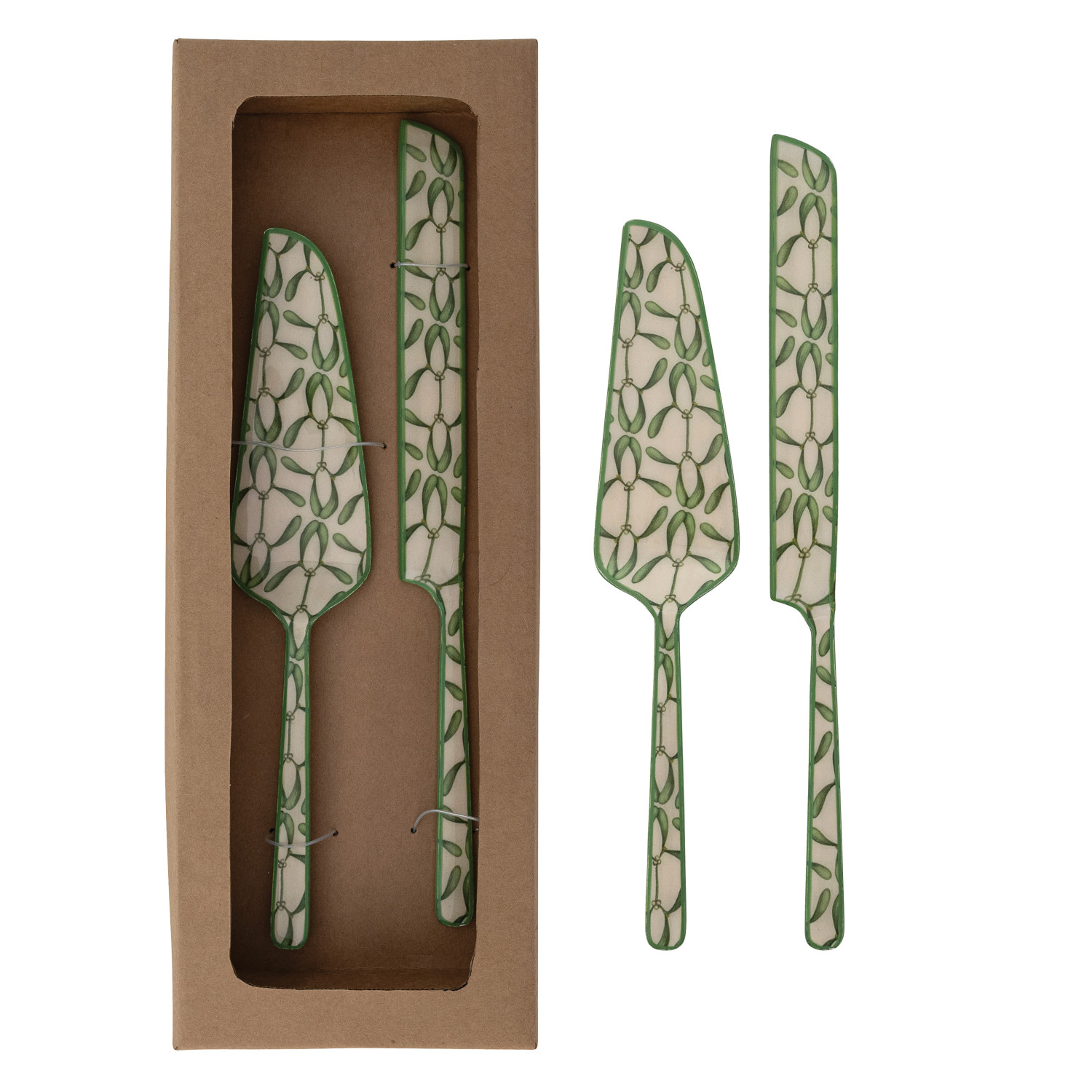 Catalog Name: 12-1/2"L & 11"L Enameled Stainless Steel Cake Knife & Server w/ Mistletoe Pattern & Colored Edge, Cream Color & Green, Boxed Set of 2 ©