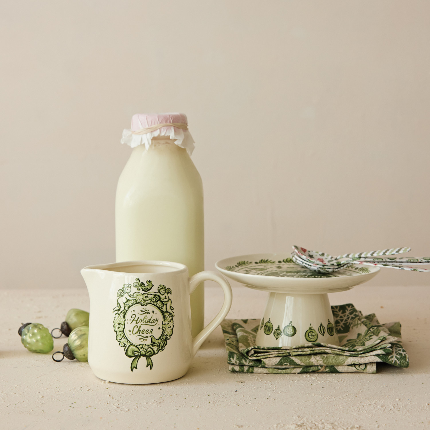 Catalog Name: 5"L x 3"W x 4"H 14 oz. Stoneware Creamer w/ Holiday Design "Holiday Cheer", Green & Cream Color ©