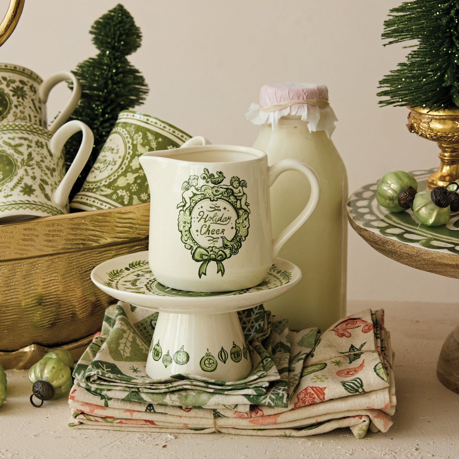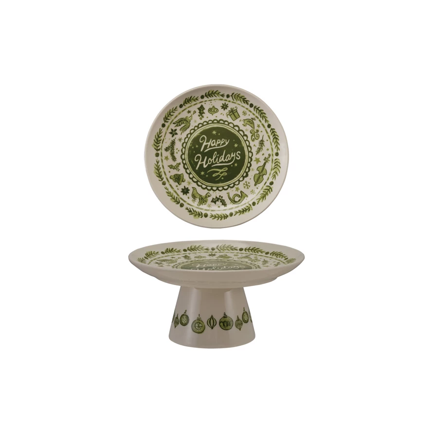 Catalog Name: 6" Round Stoneware Pedestal w/ Holiday Design "Happy Holidays", Green & Cream Color ©