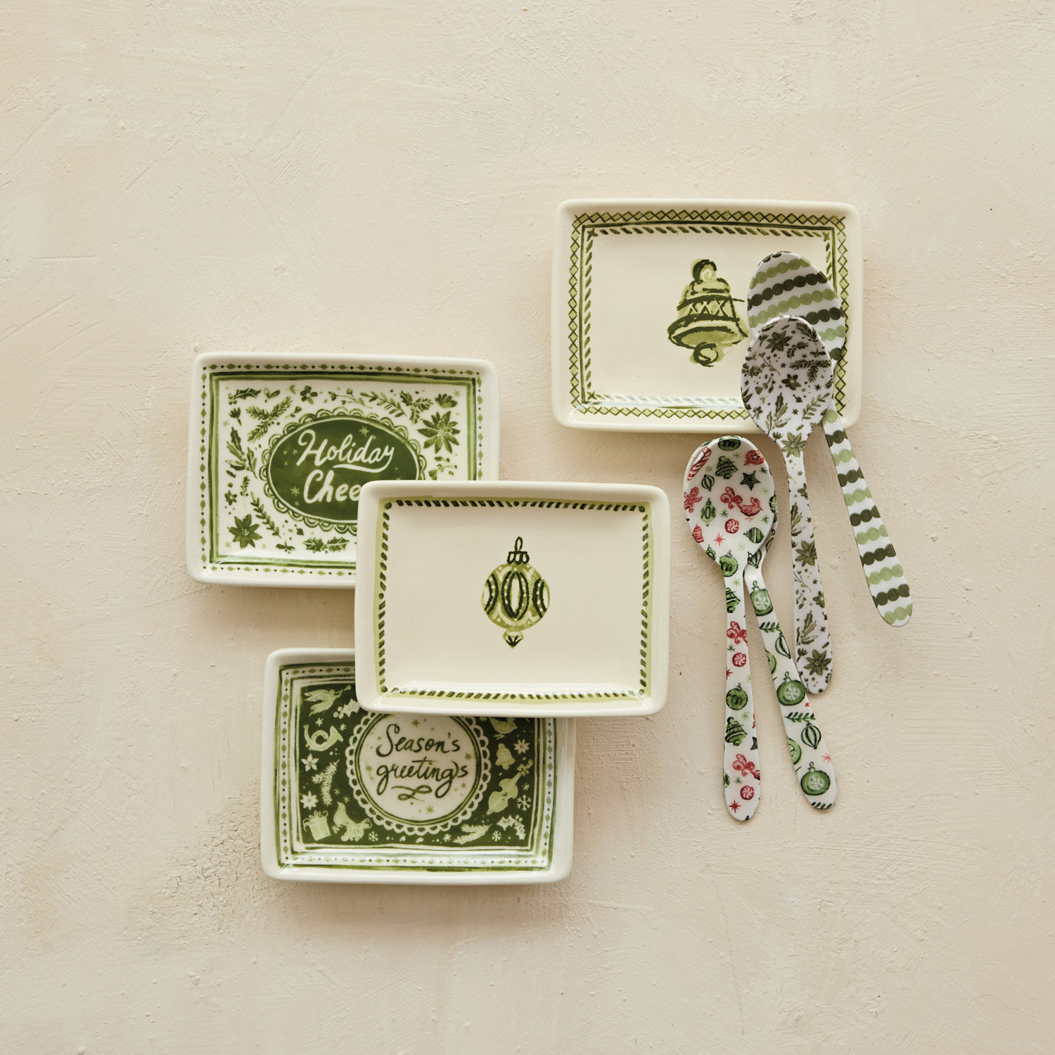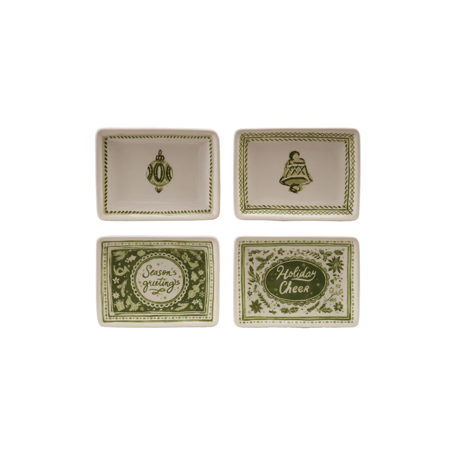 Catalog Name: 4"L x 3"W Stoneware Dish w/ Holiday Design/Saying, Green & Cream Color, 4 Styles ©