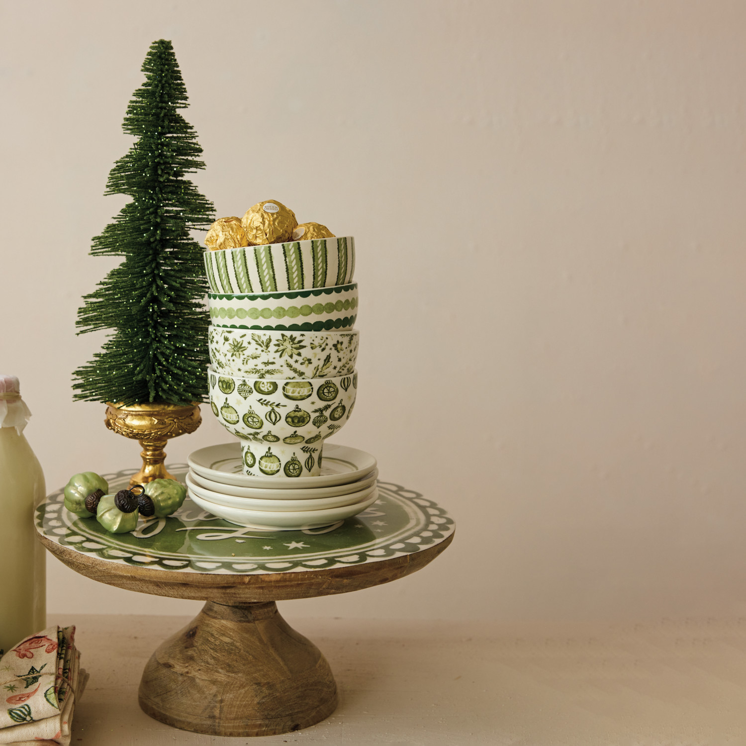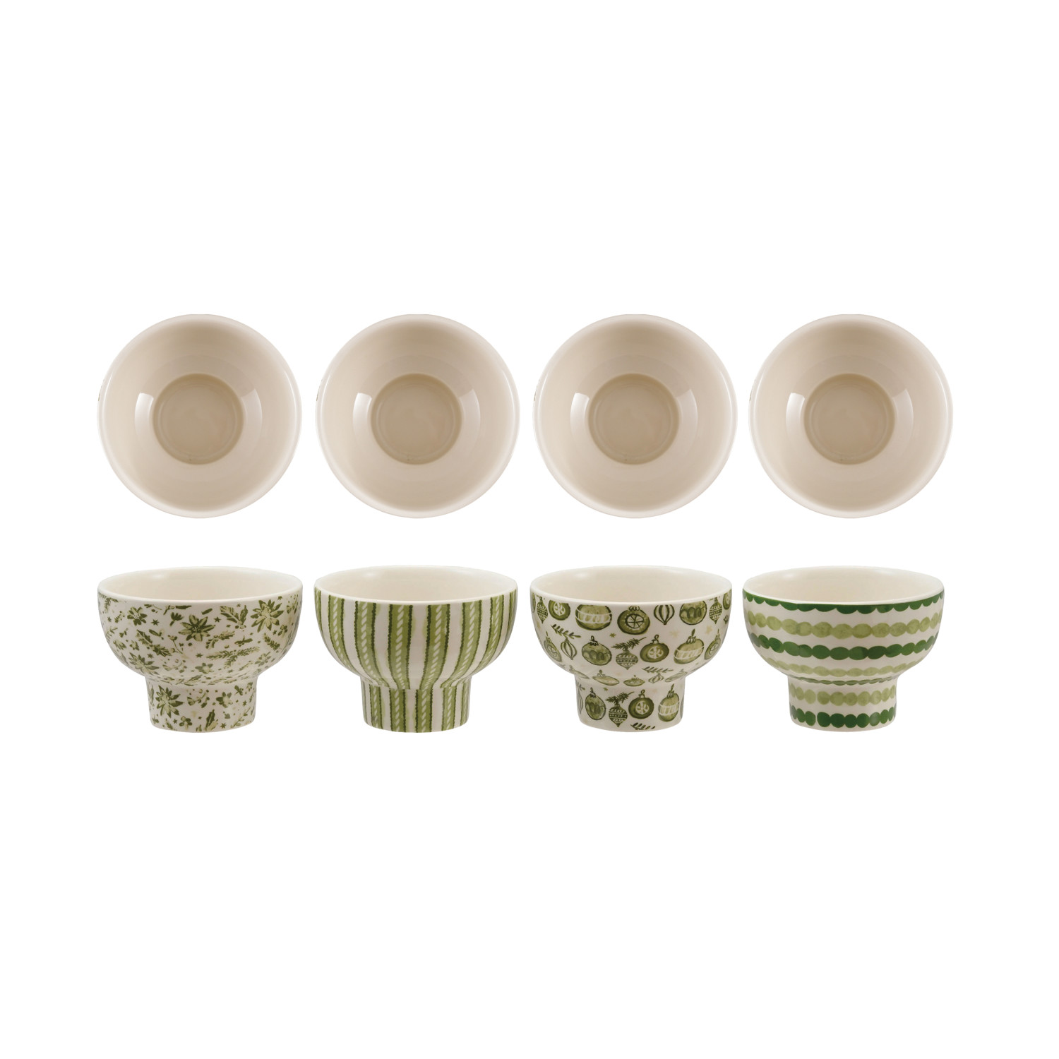 Catalog Name: 4" Round x 3"H Stoneware Footed Bowl w/ Holiday Pattern, Green & Cream Color, 4 Styles ©