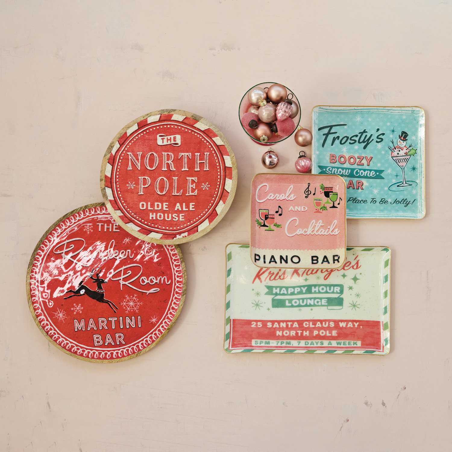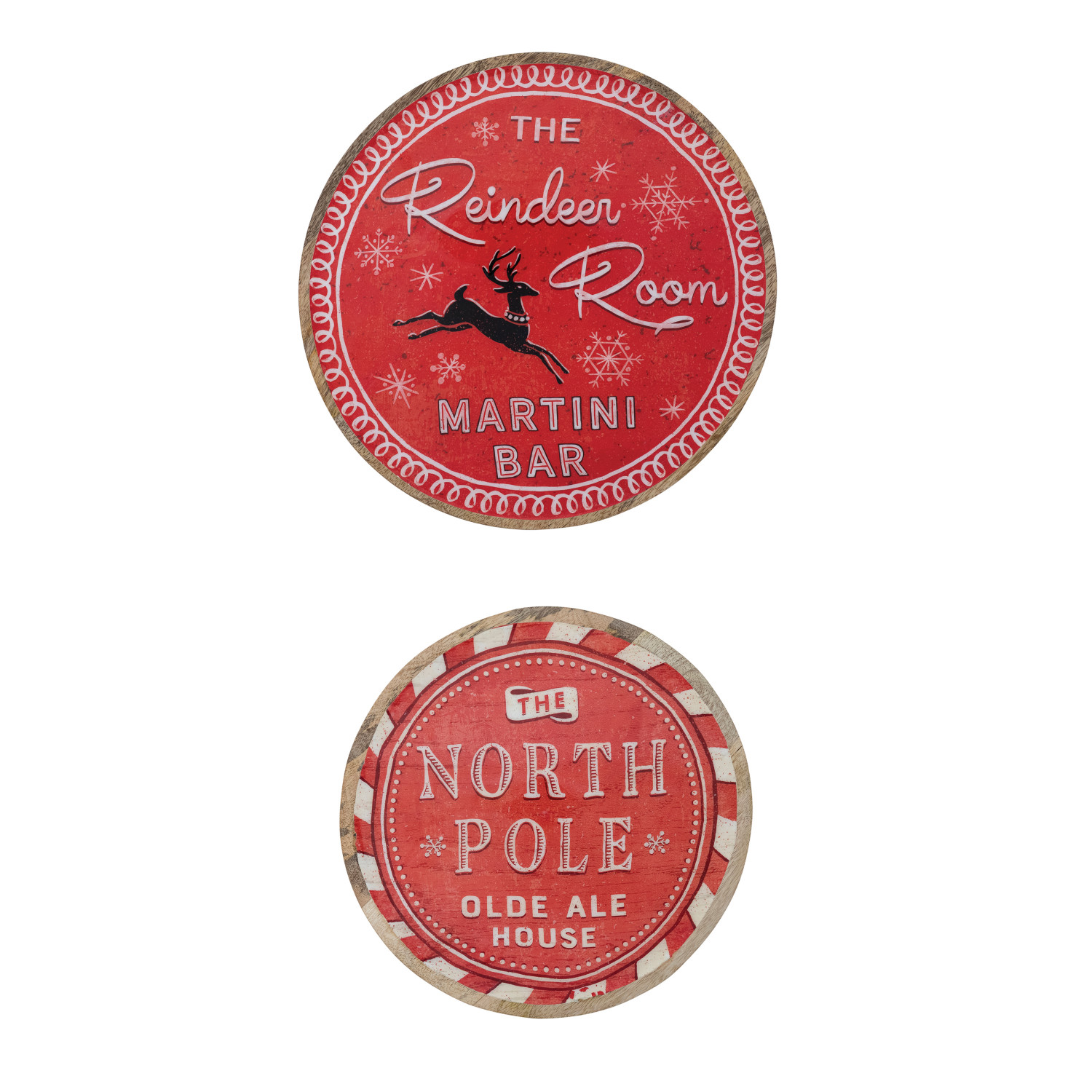 Round Enameled Mango Wood Trays with Holiday Bar Sayings, Red & Natural, Set of 2 ©
