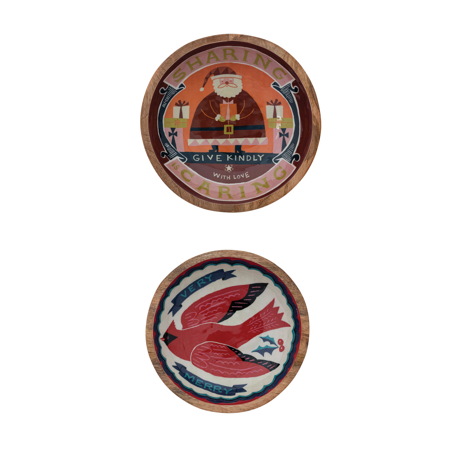 Catalog Name: 12" Round x 2-1/2"H & 9-1/2" Round x 2-1/4"H Enameled Mango Wood Bowls w/ Holiday Image & Saying, Multi Color & Natural, Set of 2 ©