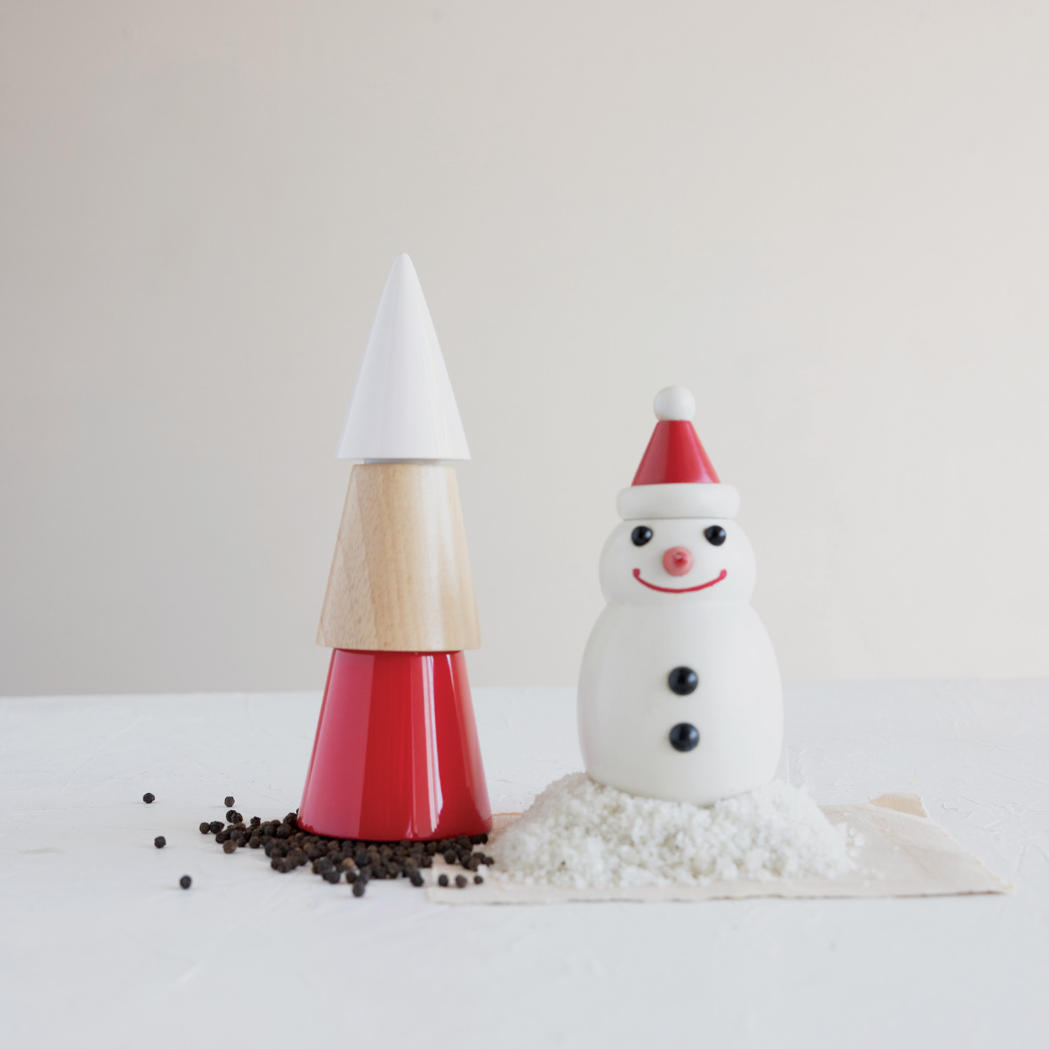 Catalog Name: 2-3/4" Round x 8"H Rubberwood Tree Shaped Salt/Pepper Mill, White, Natural & Red