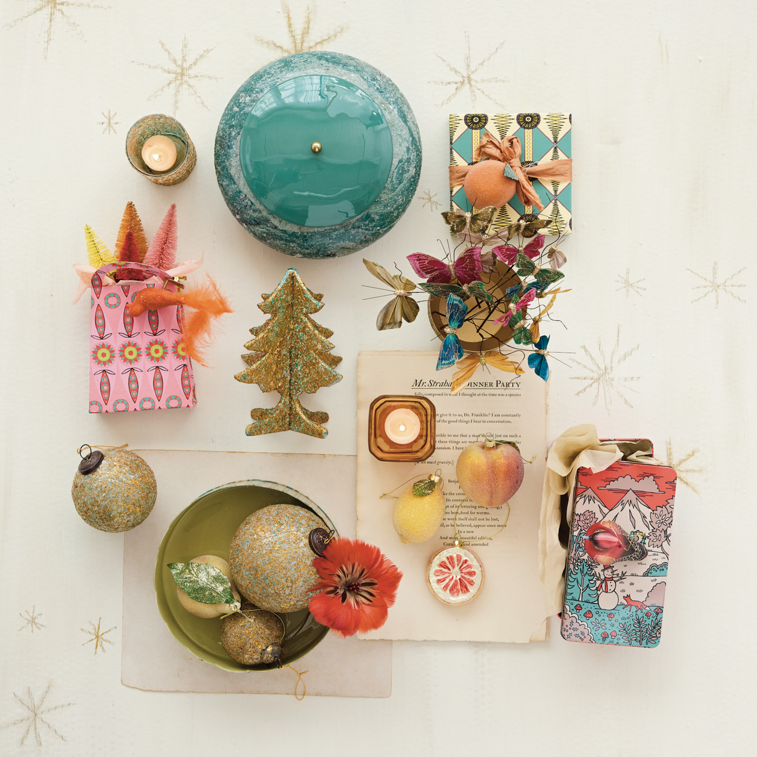 Decorative Metal Box with Mica Flakes, Enameled Lid, Interior Knob, Marbled Green