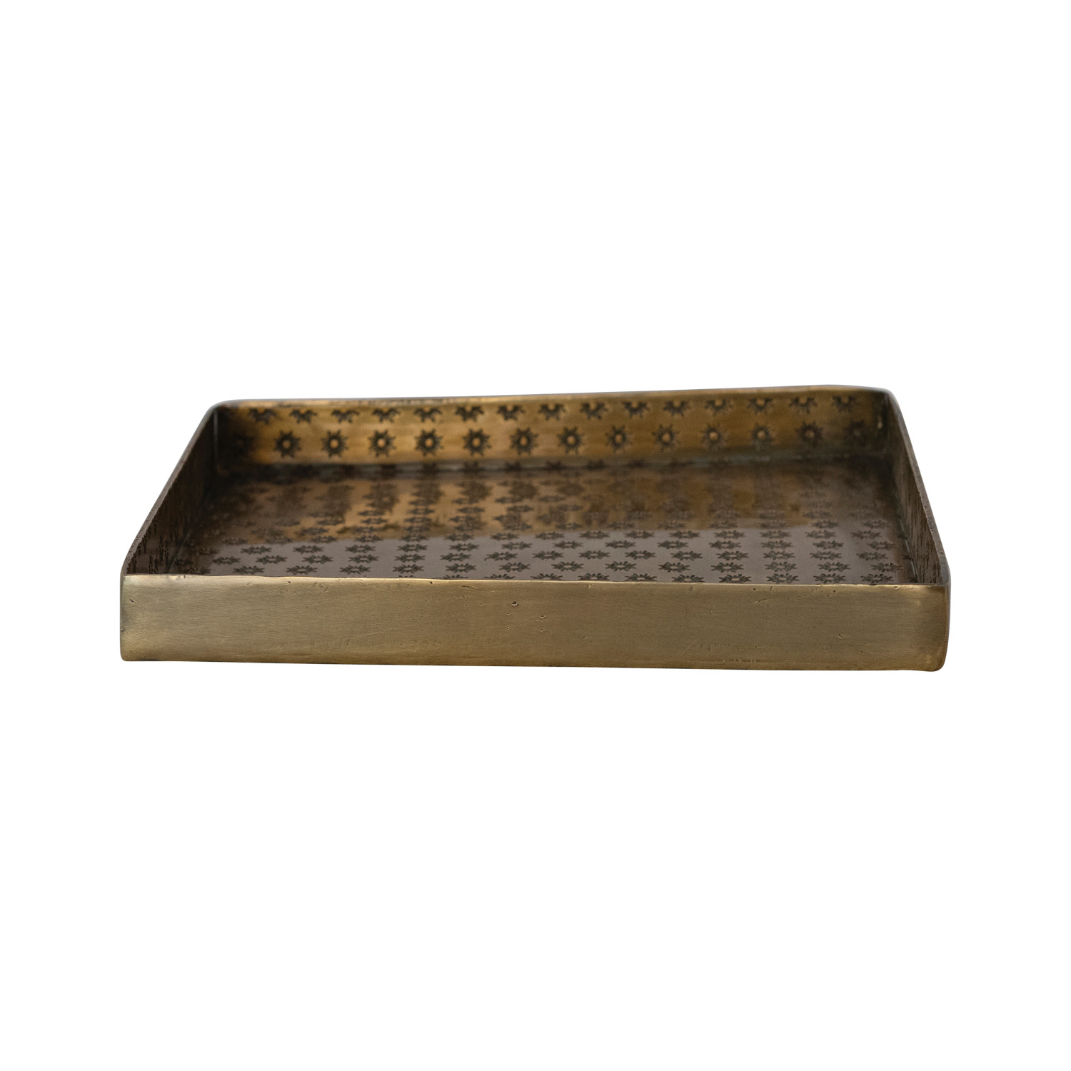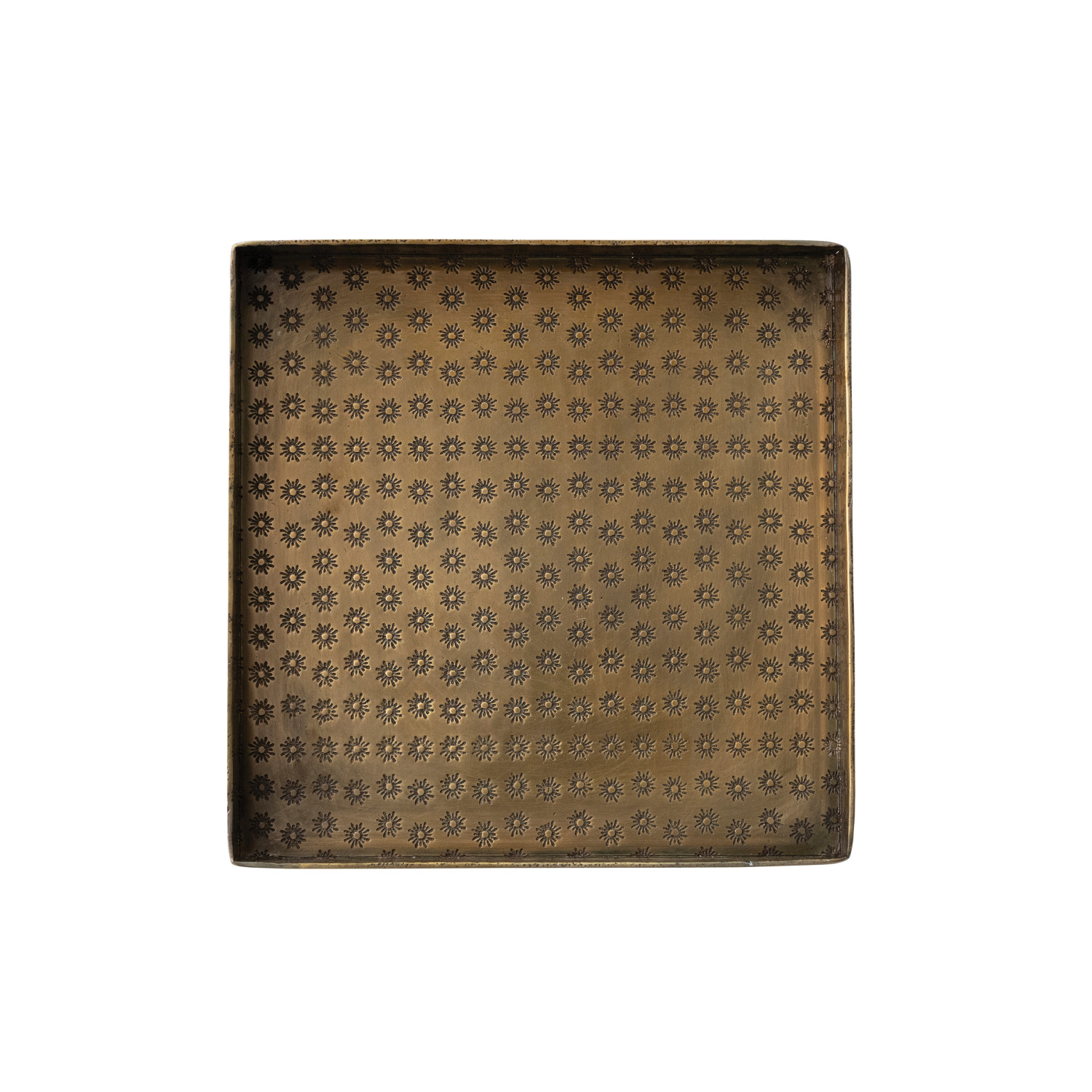 Catalog Name: 9-1/2" Square Debossed Aluminum Tray, Antique Brass Finish