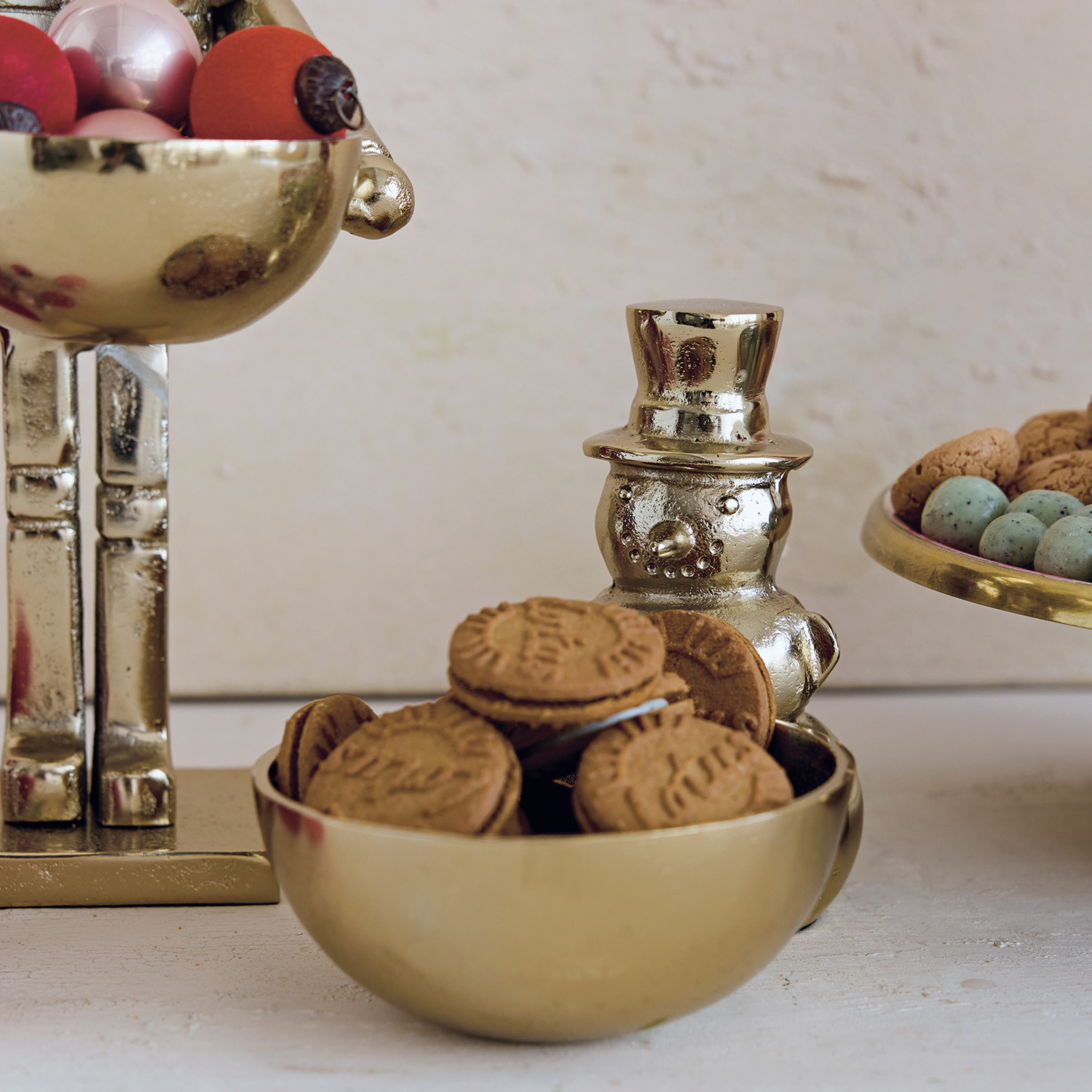 Catalog Name: 7-1/2"L x 5"W x 5-1/2"H Cast Aluminum Snowman Holding Bowl, Gold Finish