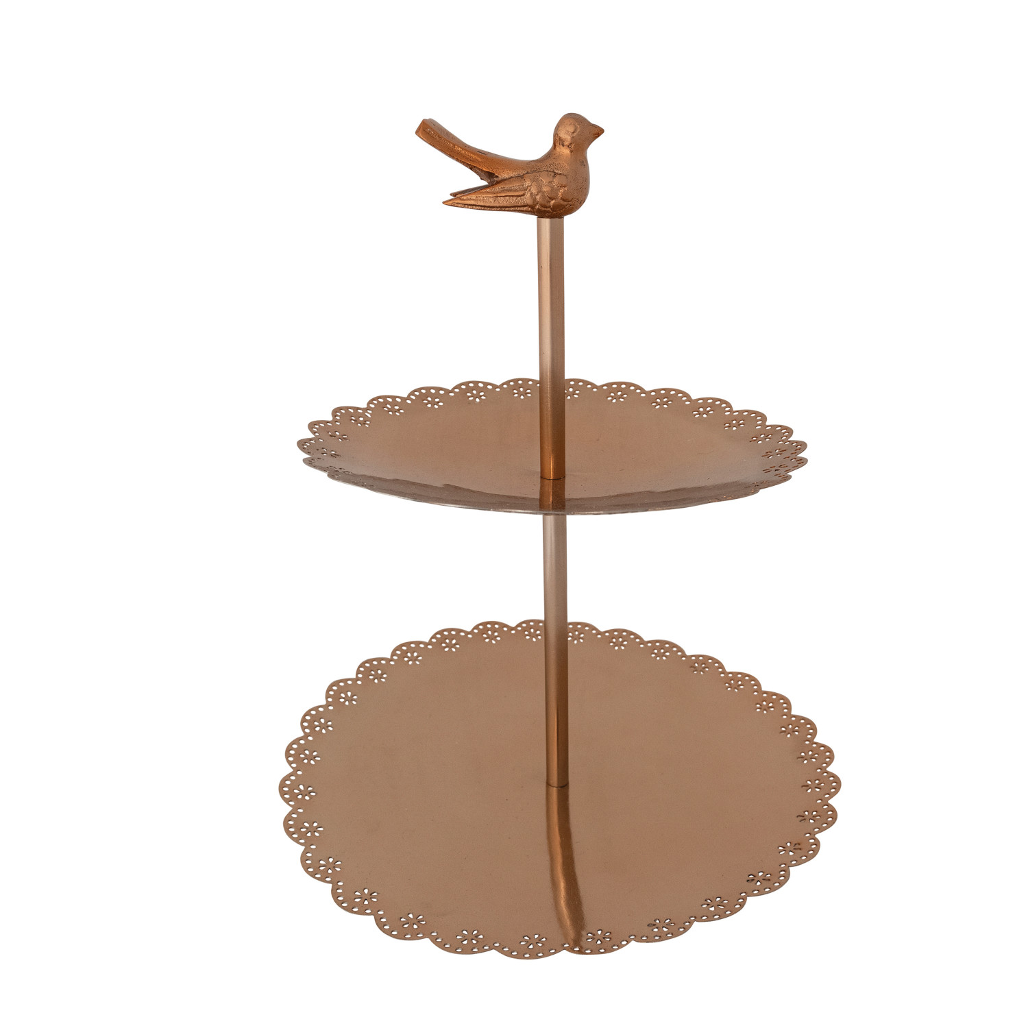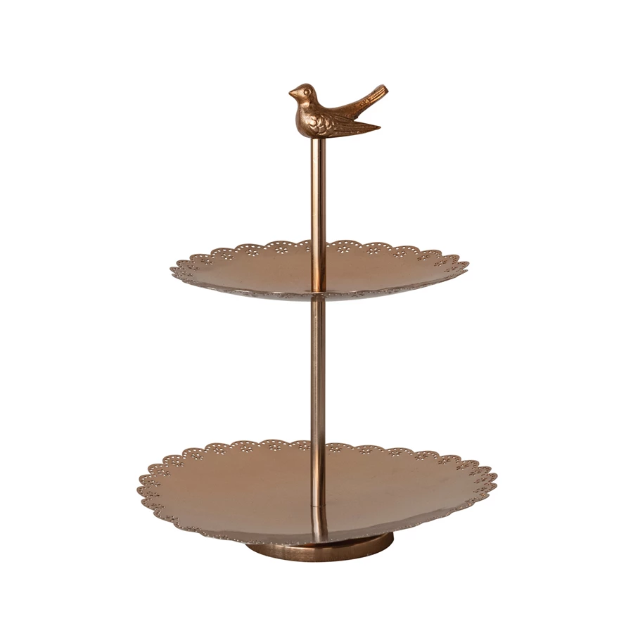 Catalog Name: 12" Round x 15-1/4"H Metal Scalloped 2-Tier Tray w/ Floral Cut-Outs & Bird Shaped Handle, Copper Finish, KD