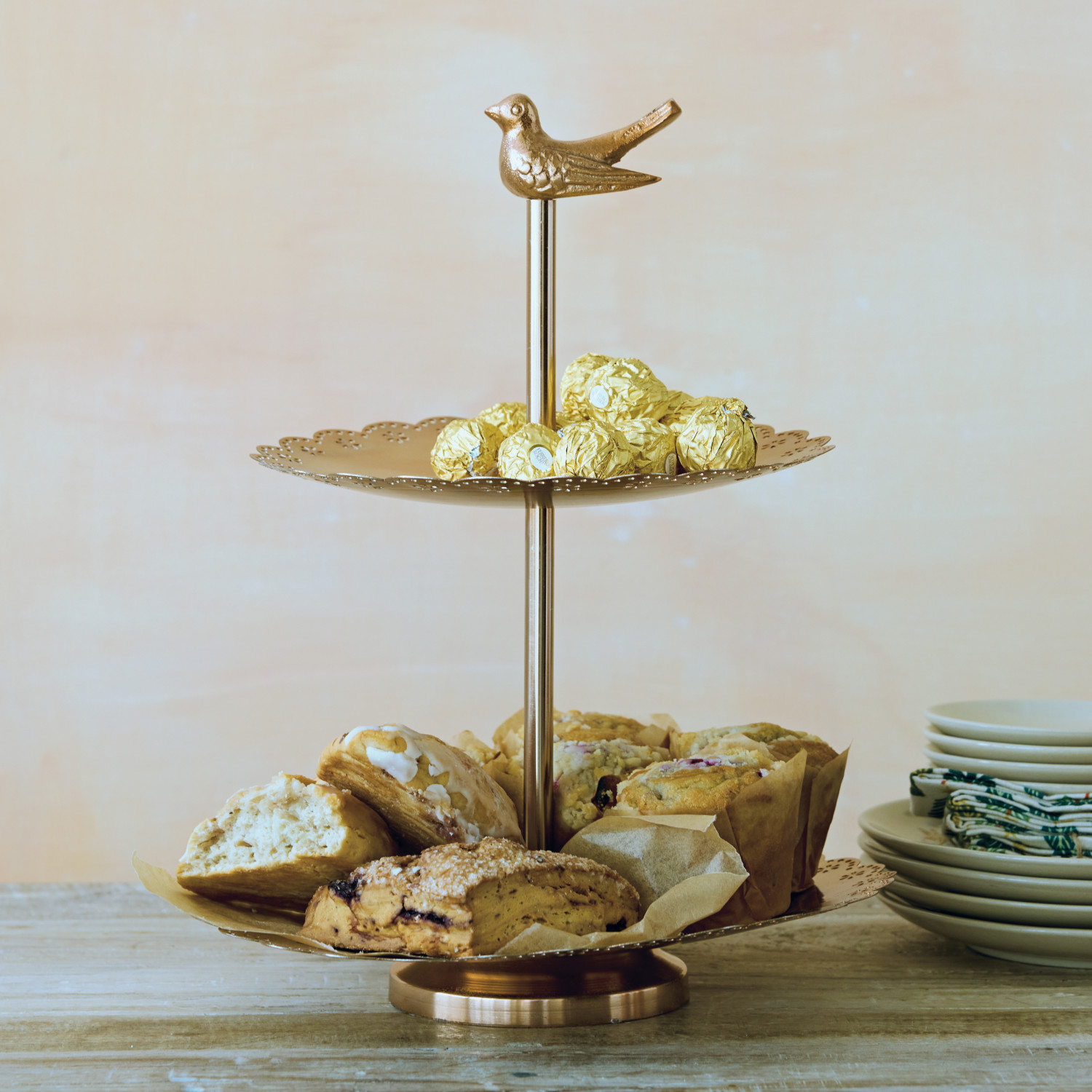 Metal Scalloped 2-Tier Tray with Floral Cut-Outs & Bird Shaped Handle, KD