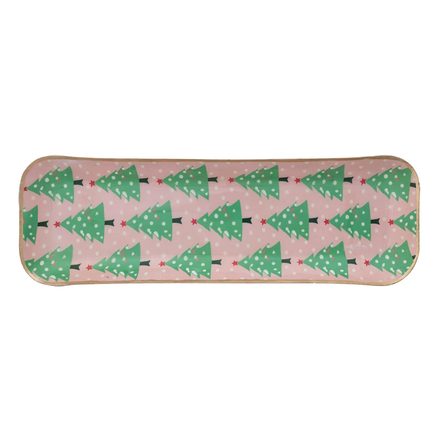 Catalog Name: 16-1/2"L x 5-1/4"W Enameled Metal Tray w/ Tree Pattern & Gold Edges, Multi Color