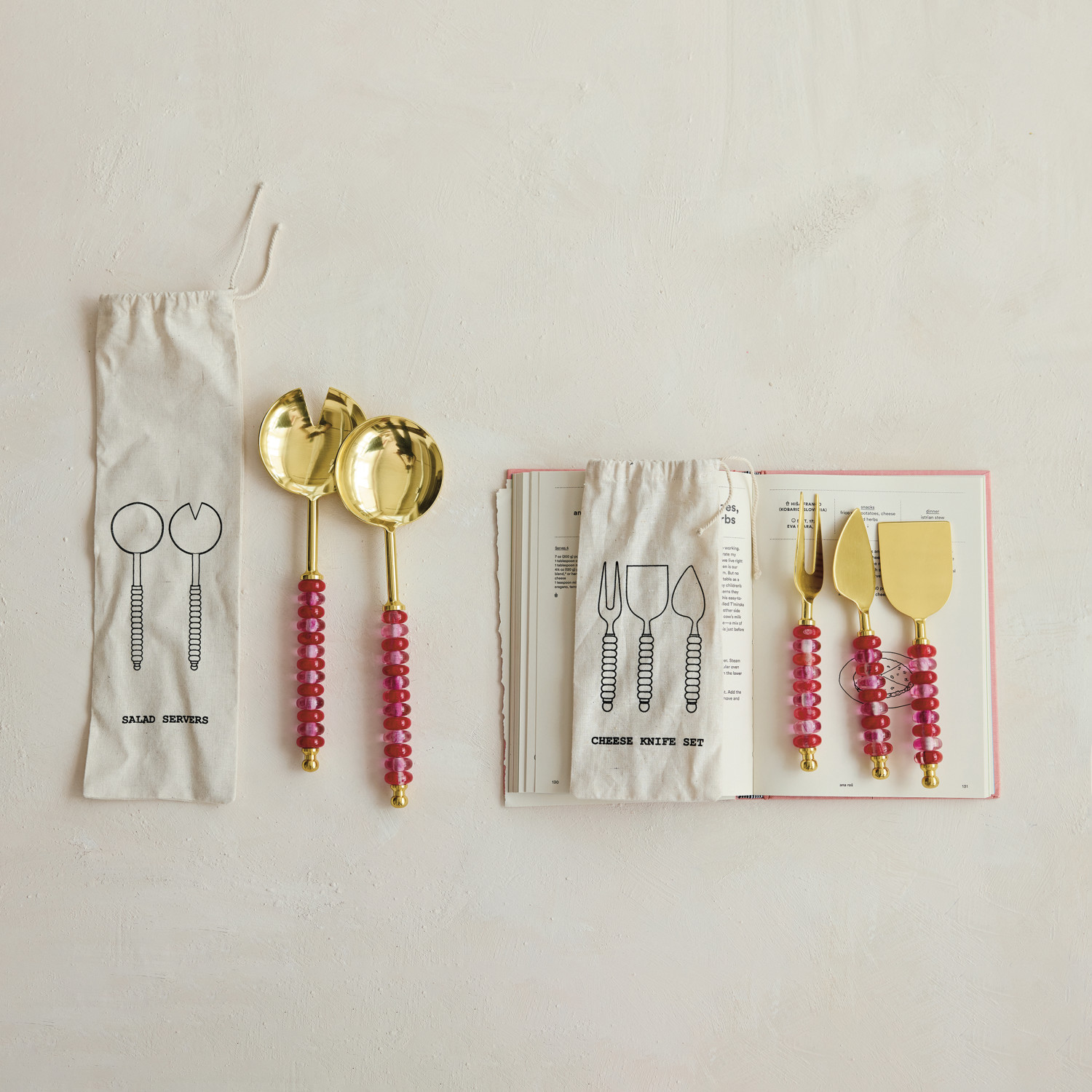 Catalog Name: 10-3/4"L Stainless Steel Salad Servers w/ Resin Handles, Gold Finish, Pink & Red, Set of 2 in Printed Drawstring Bag