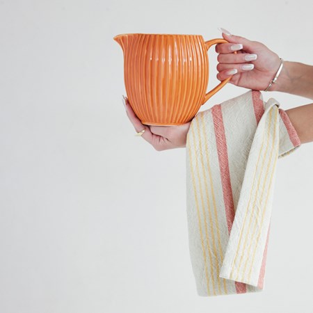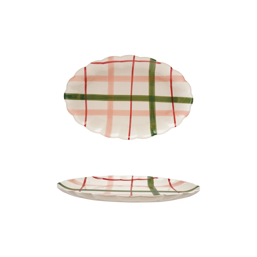 Catalog Name: 16"L x 10-1/2"W Oval Hand-Painted Stoneware Scalloped Platter w/ Plaid Pattern, Multi Color