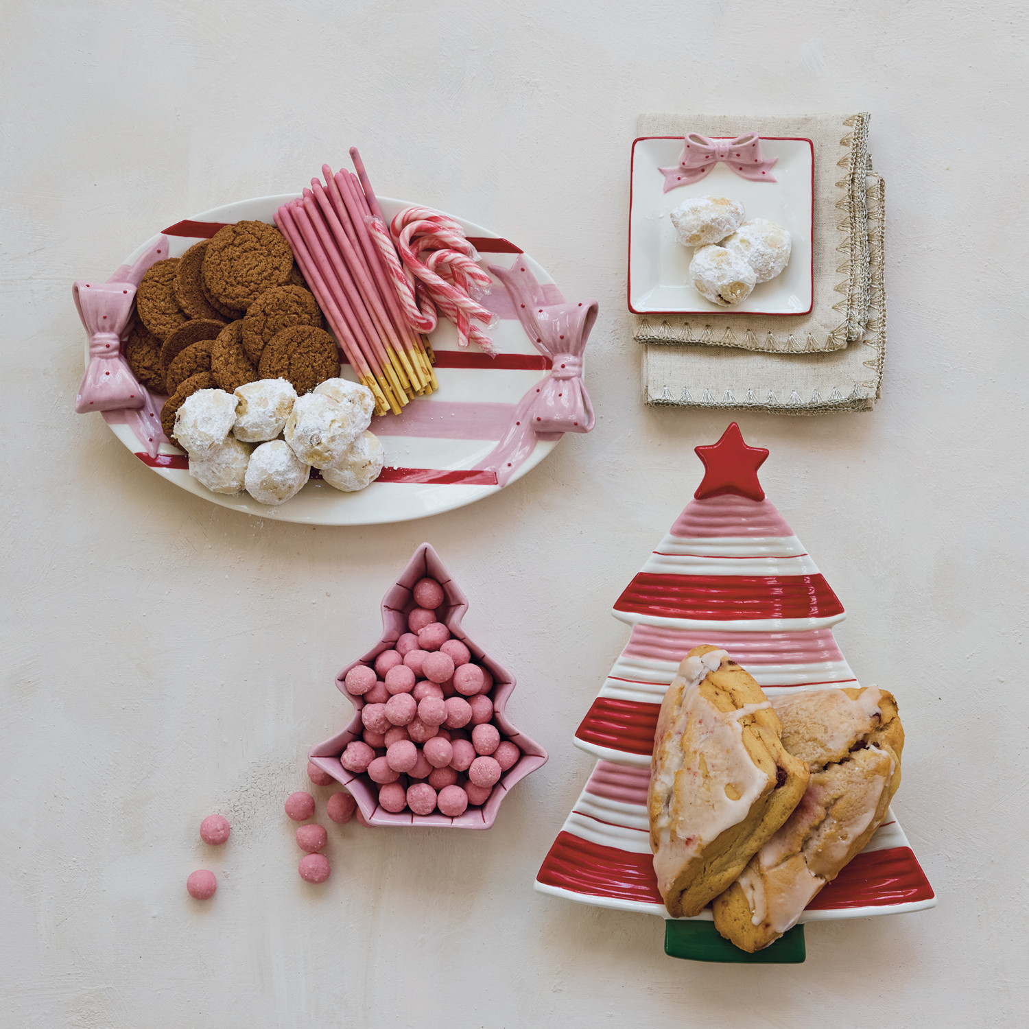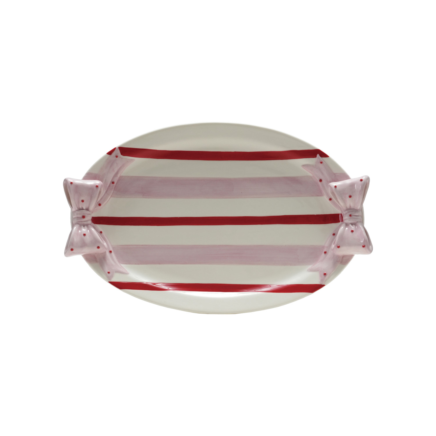 Catalog Name: 11-1/4"L x 7"W Oval Hand-Painted Stoneware Striped Platter w/ Polka Dot Bow Shaped Handles, White, Pink & Red