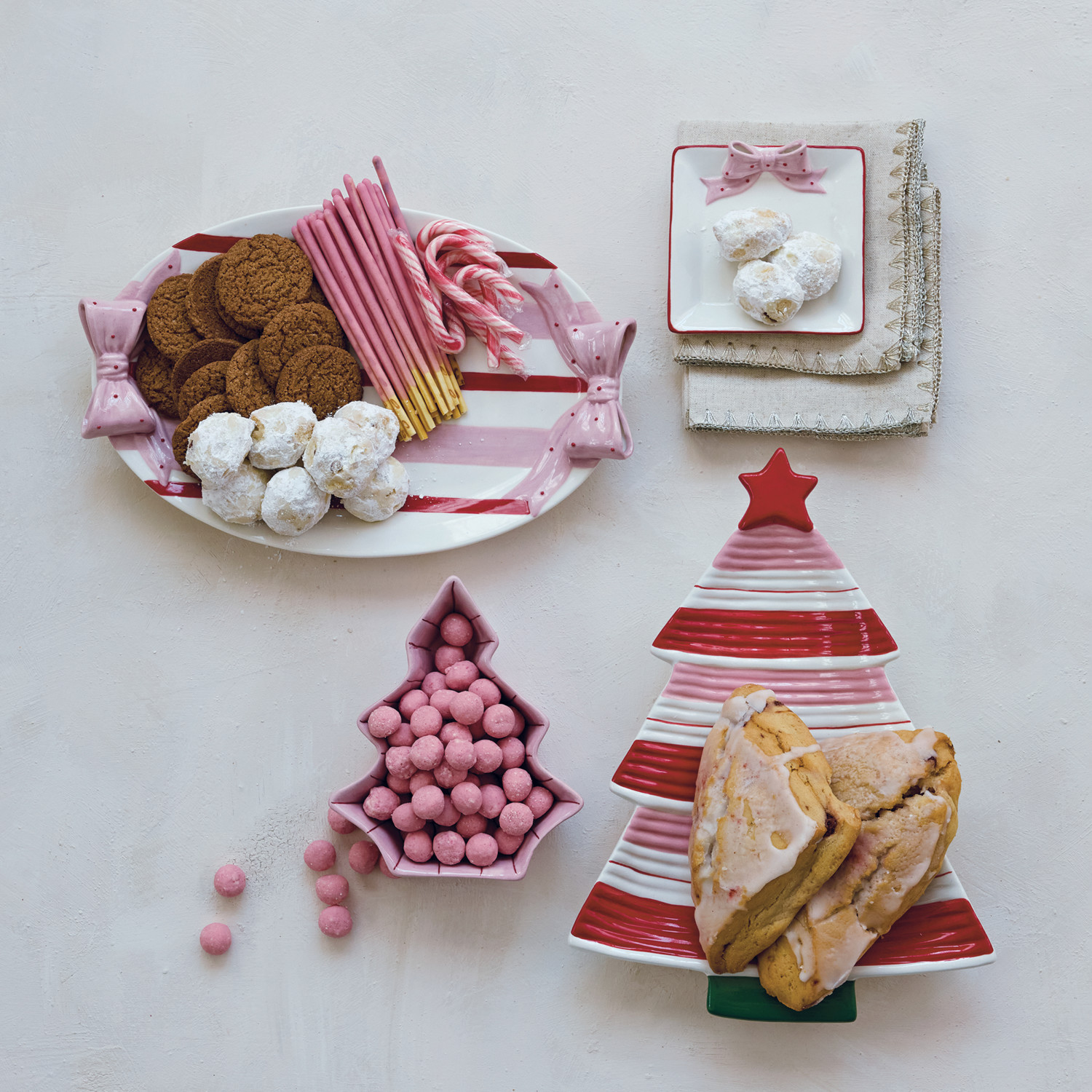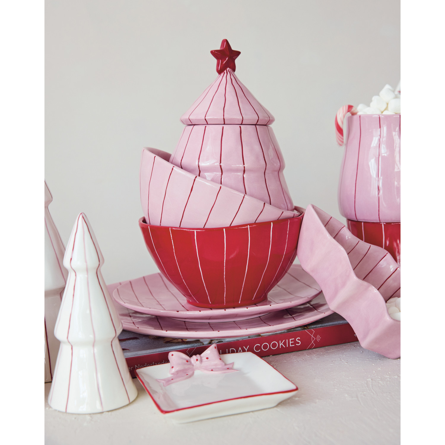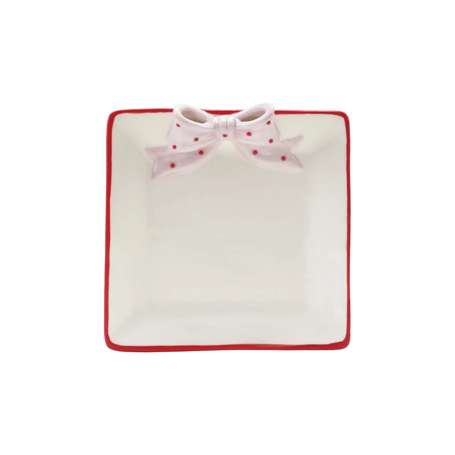 Catalog Name: 4" Square Hand-Painted Stoneware Dish w/ 3D Polka Dot Bow & Colored Edge, White, Pink & Red