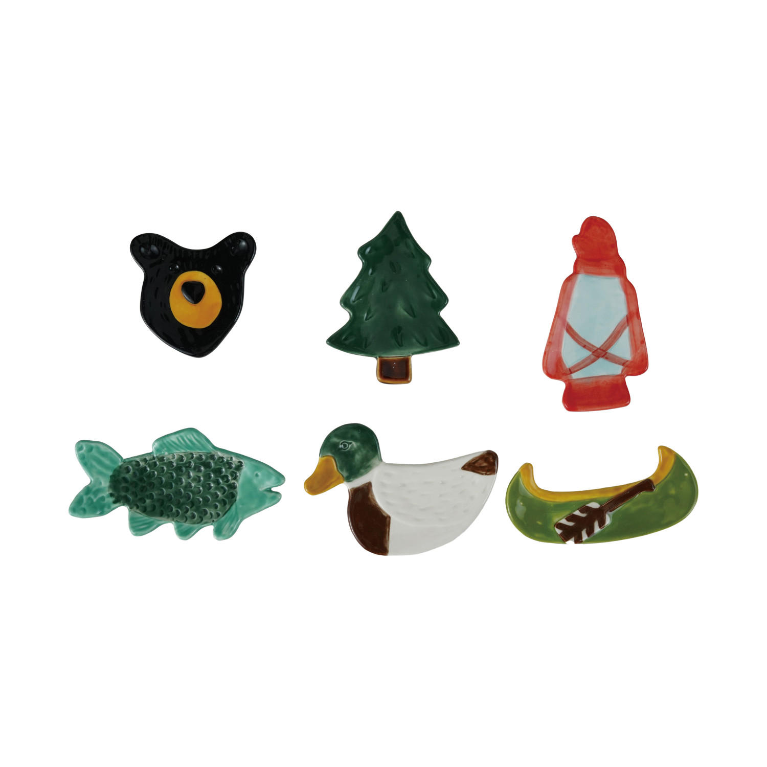 Catalog Name: 4-1/4"L - 5-1/4"L Hand-Painted Stoneware Outdoor Icon Shaped Dish, Multi Color, 6 Styles (Each One Will Vary) ©