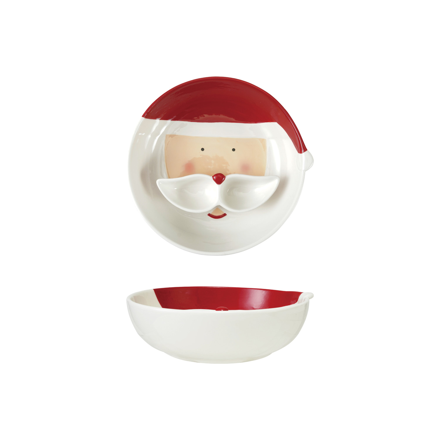 Catalog Name: 10-1/4" Round x 3"H Hand-Painted Ceramic Santa Head Shaped Bowl & Mustache Dish w/ 2 Sections, White & Red, Set of 2