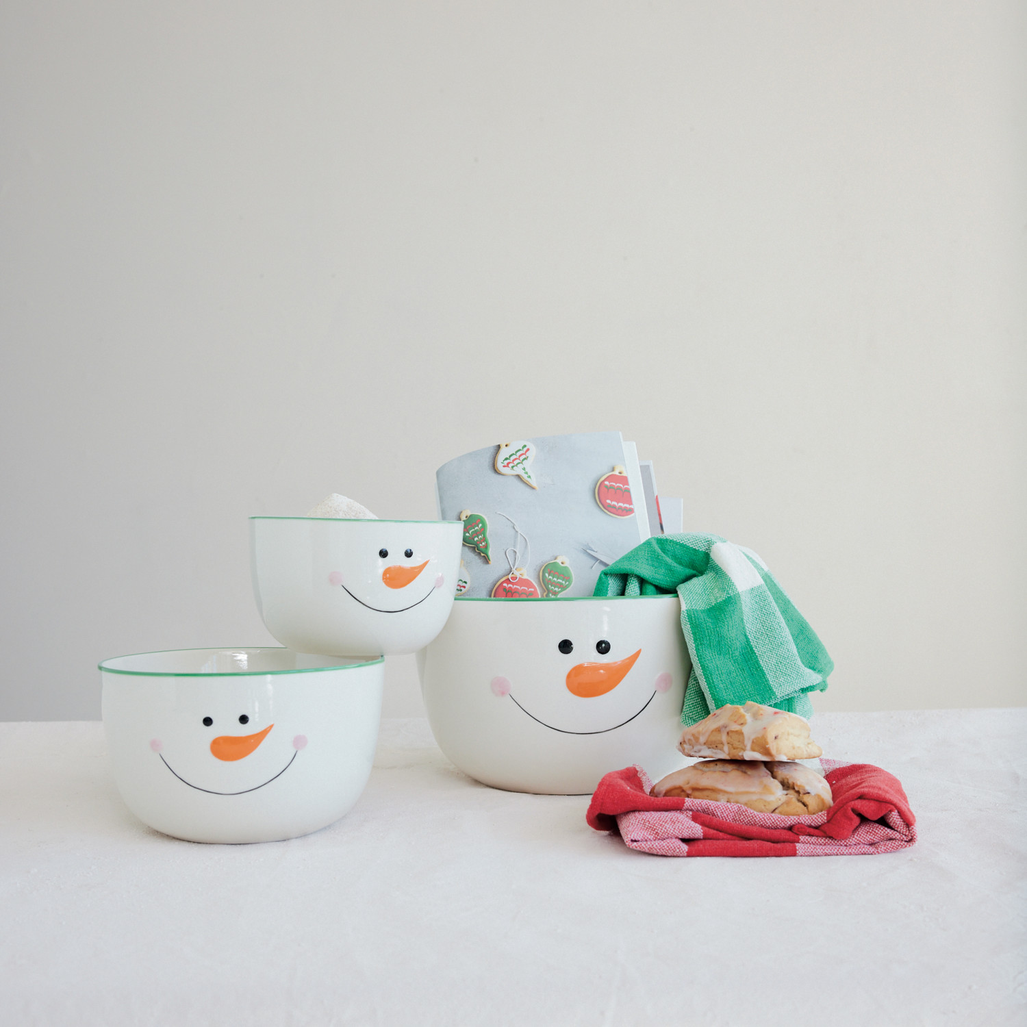 Stoneware Nesting Bowls with Snowman Face & Green Rim, Set of 3