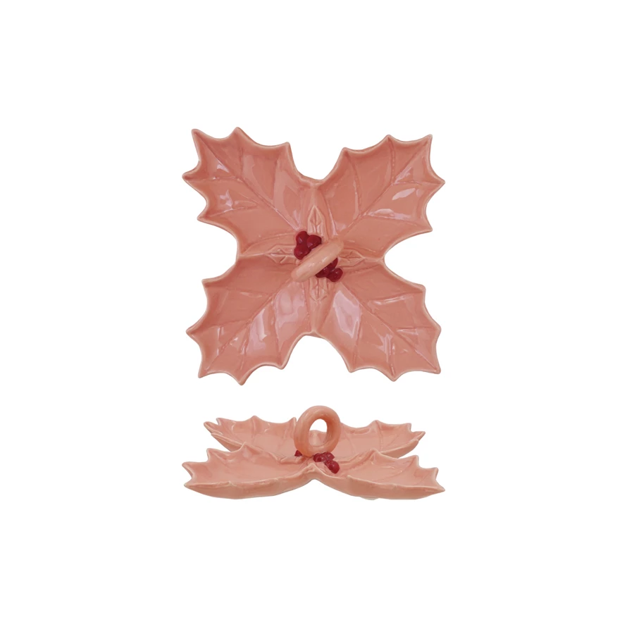 Catalog Name: 10-1/2"L x 6-3/4"W x 2-3/4"H Ceramic Holly Shaped Dish w/ 4 Sections & Handle, Pink & Red