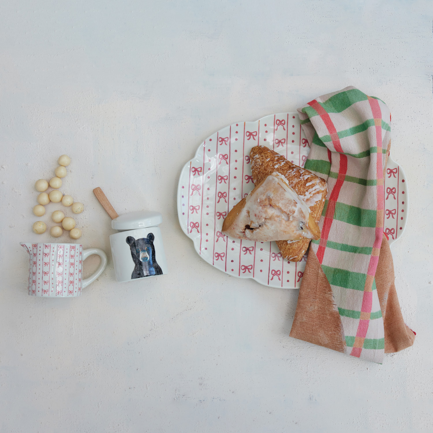 Catalog Name: 5"L x 3"W x 3"H 4 oz. Stoneware Creamer w/ Bow Pattern & 2-3/4" Round x 3"H Stoneware Sugar Pot w/ Bear, Lid & Wood Spoon, Multi Color, Set of 3 ©