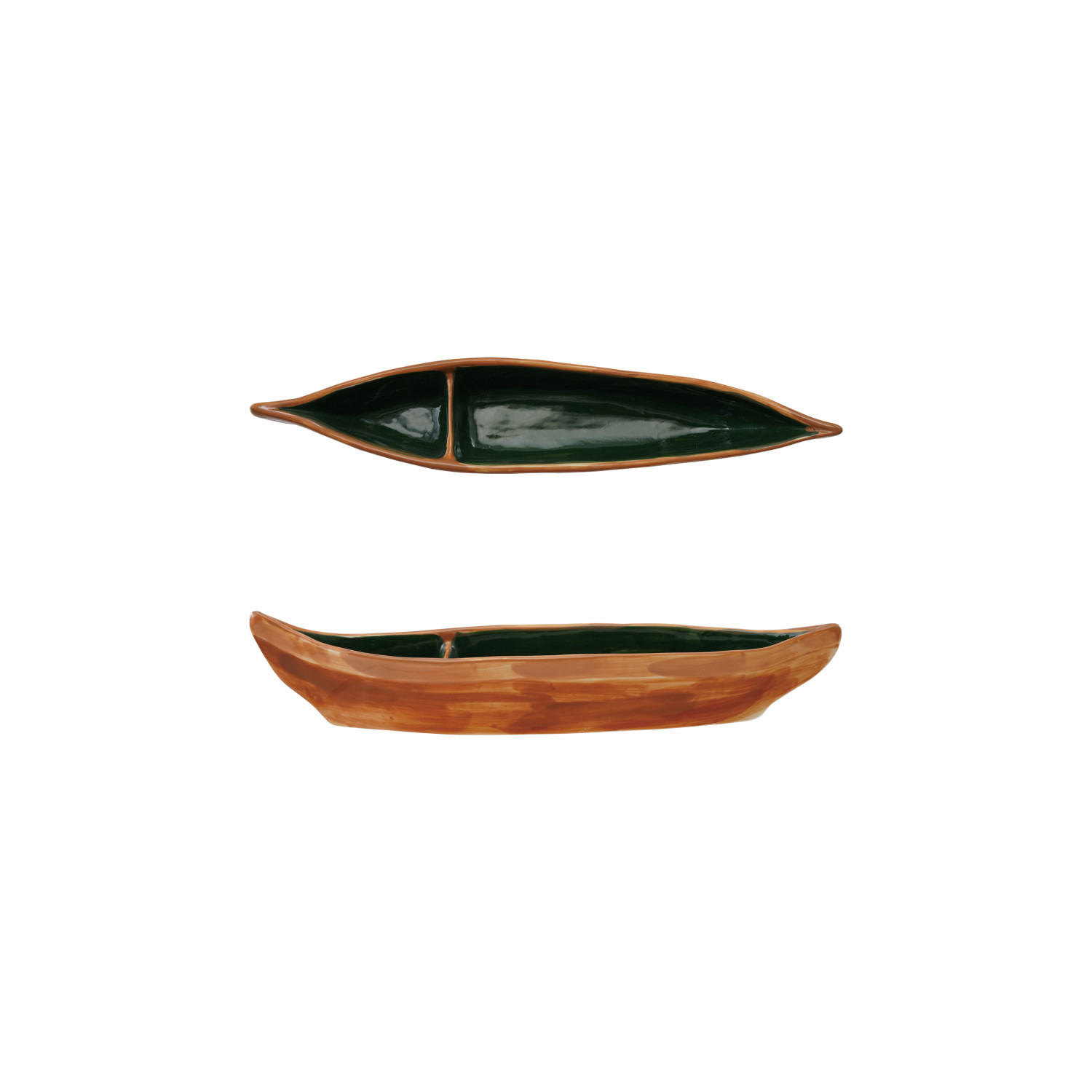 Catalog Name: 11-1/2"L x 2-1/4"W x 2-1/4"H Hand-Painted Stoneware Canoe Shaped Dish w/ 2 Sections, Brown & Green (Each One Will Vary) ©
