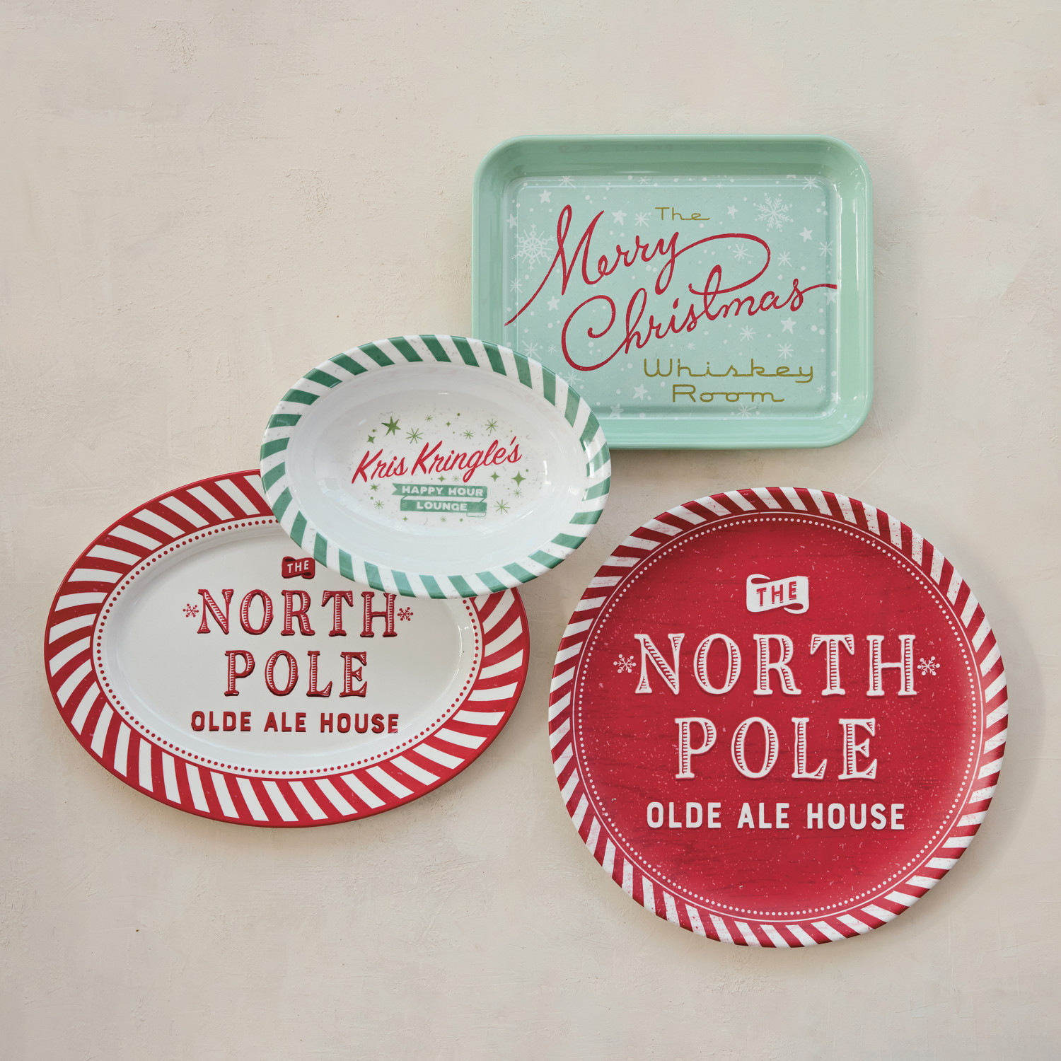 Melamine Platter/Tray with Striped Border "The North Pole…", Matte Finish, Red & White ©