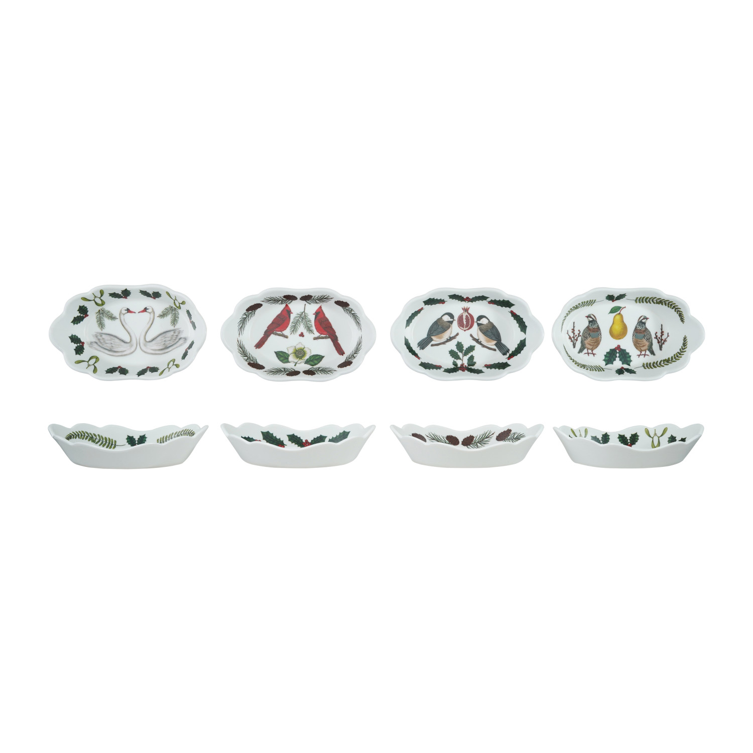 Catalog Name: 4-1/2"L x 2-1/2"W Melamine Scalloped Dish w/ Seasonal Botanicals & Animals, Matte Finish, Multi Color, 4 Styles ©