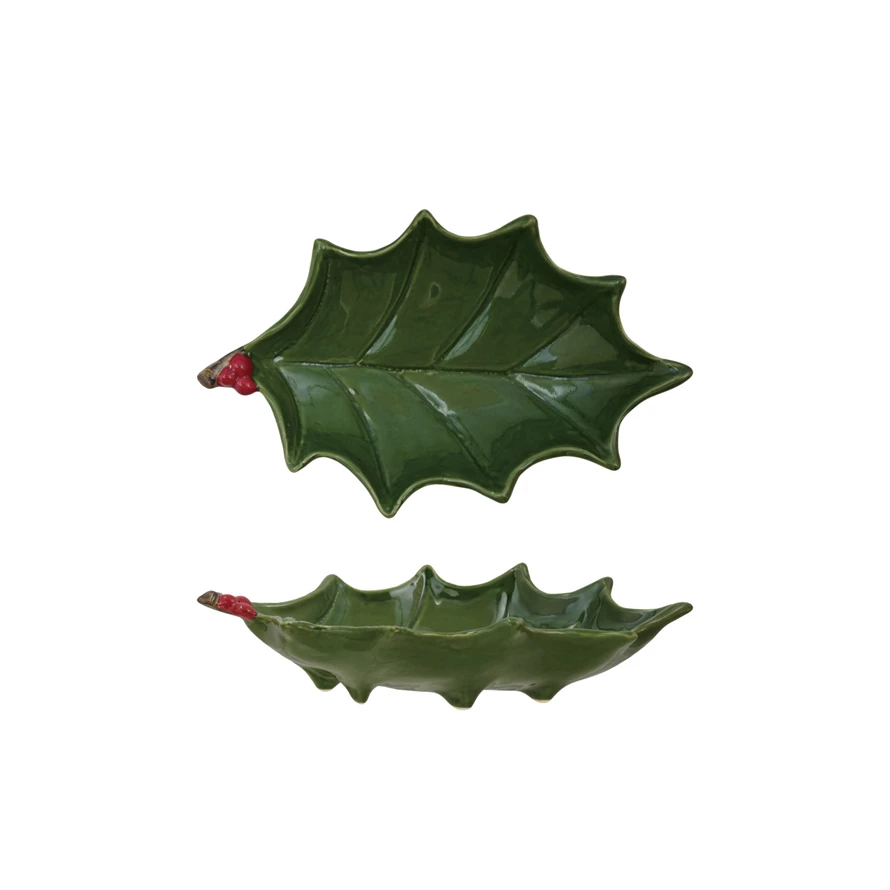 Catalog Name: 11-1/2"L x 7"W Hand-Painted Holly Leaf Shaped Footed Tray w/ Berries, Green & Red