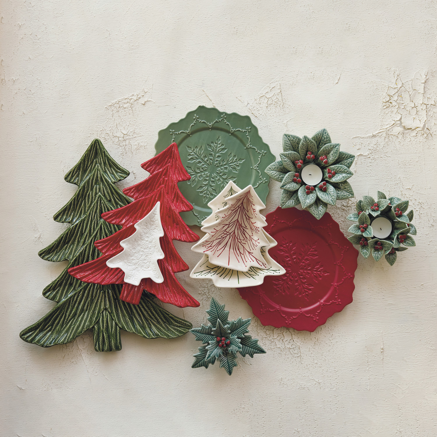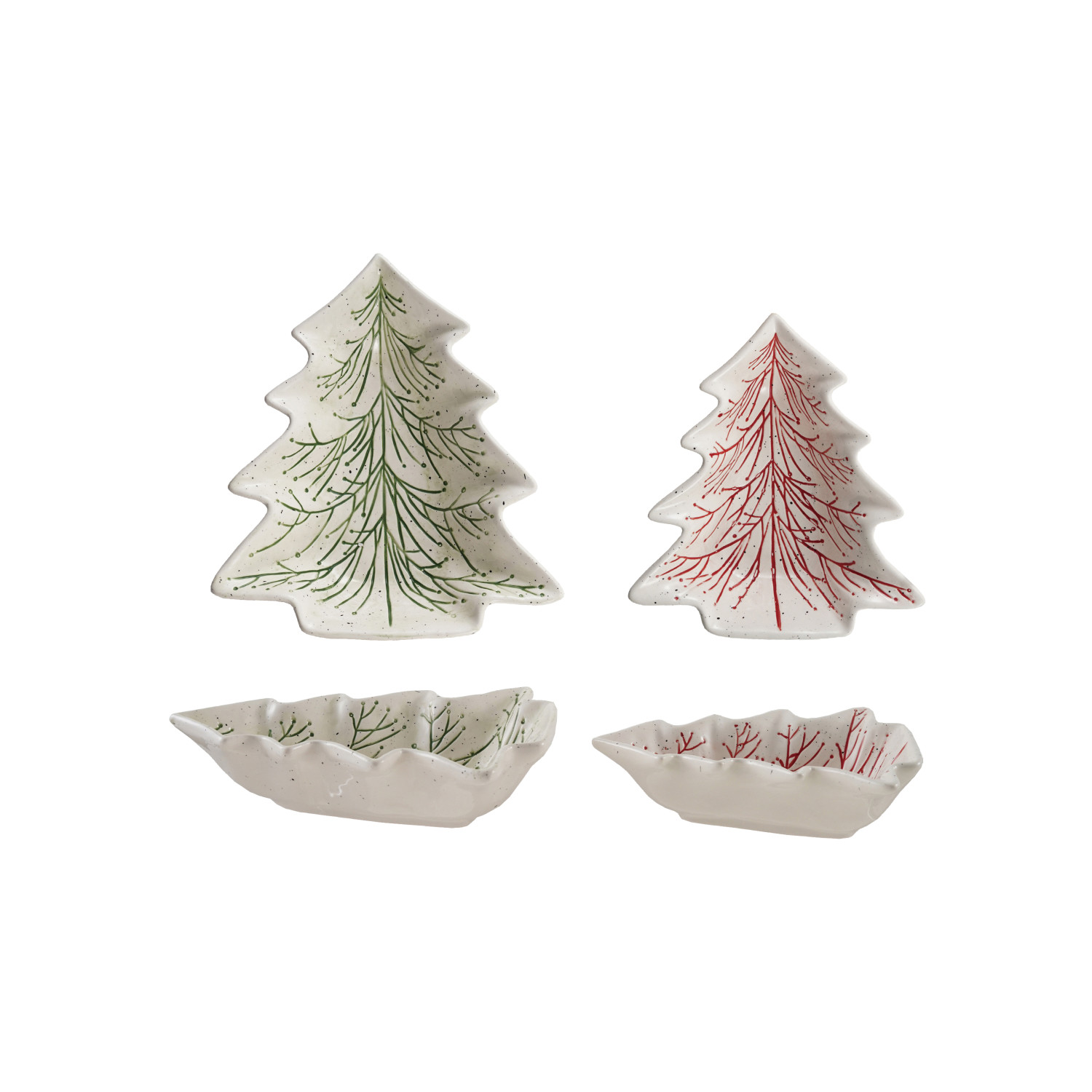 Catalog Name: 7-1/4"L x 6-1/2"W & 6-1/4"L x 5-1/2"W Hand-Painted Ceramic Tree Shaped Dishes, White, Green & Red, Set of 2