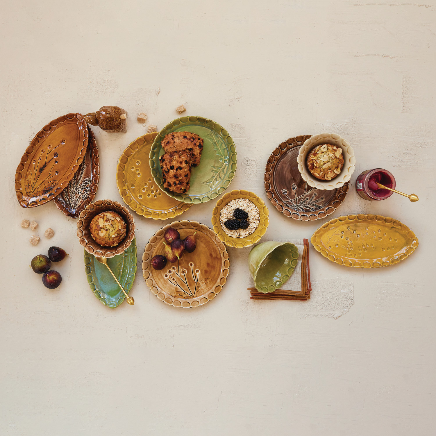 Catalog Name: 8" Round Debossed Stoneware Scalloped Plate w/ Botanicals, Reactive Glaze, 4 Styles (Each One Will Vary) ©