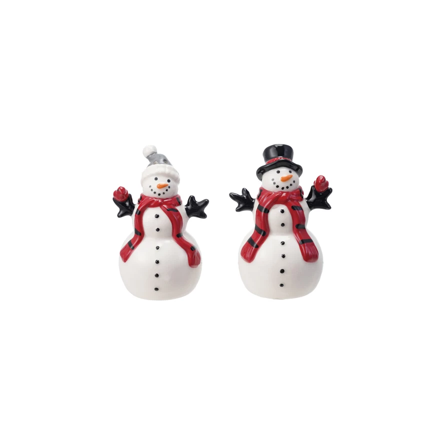 Catalog Name: 2" Round x 4"H Stoneware Snowmen Salt & Pepper Shakers, Red, Black & White, Set of 2 ©