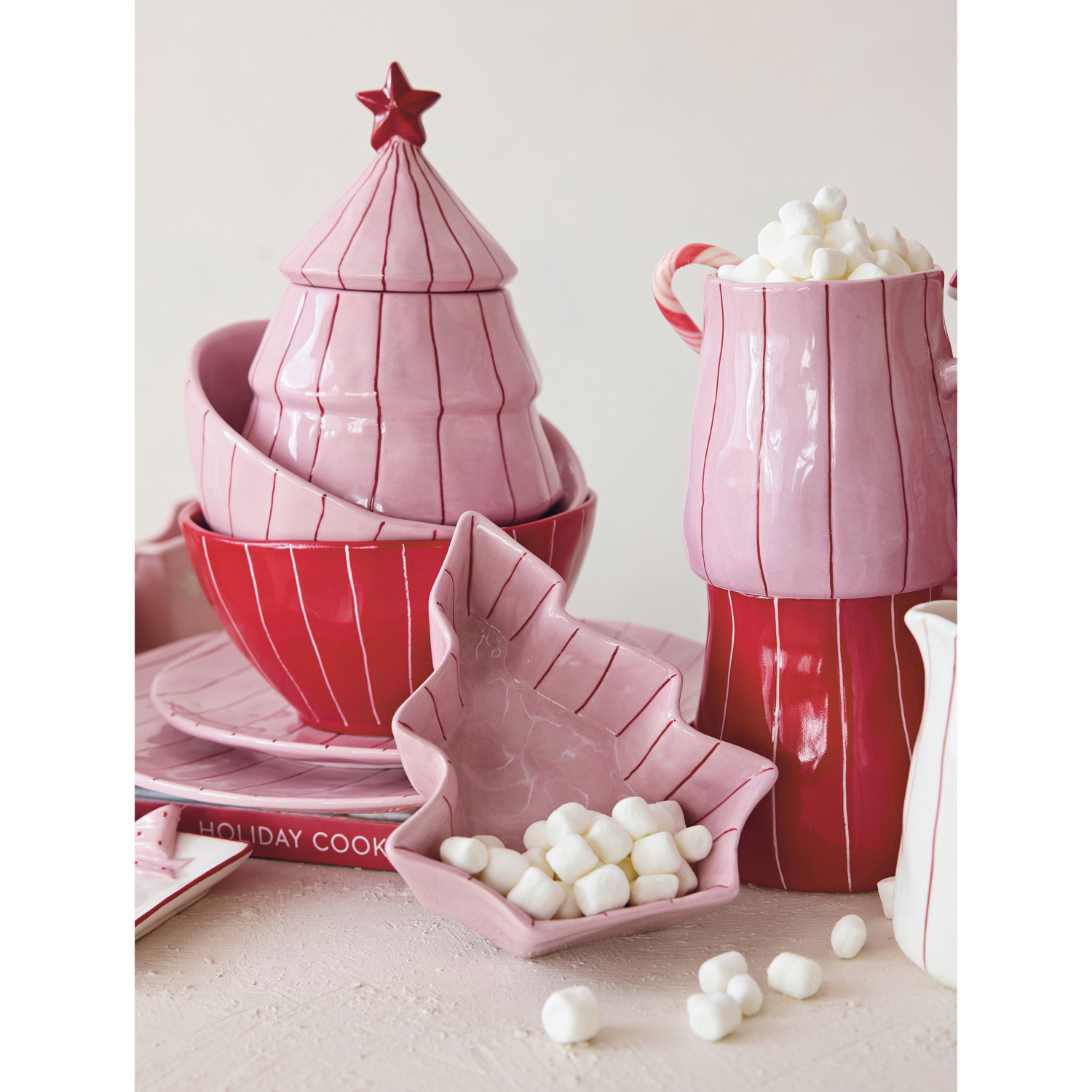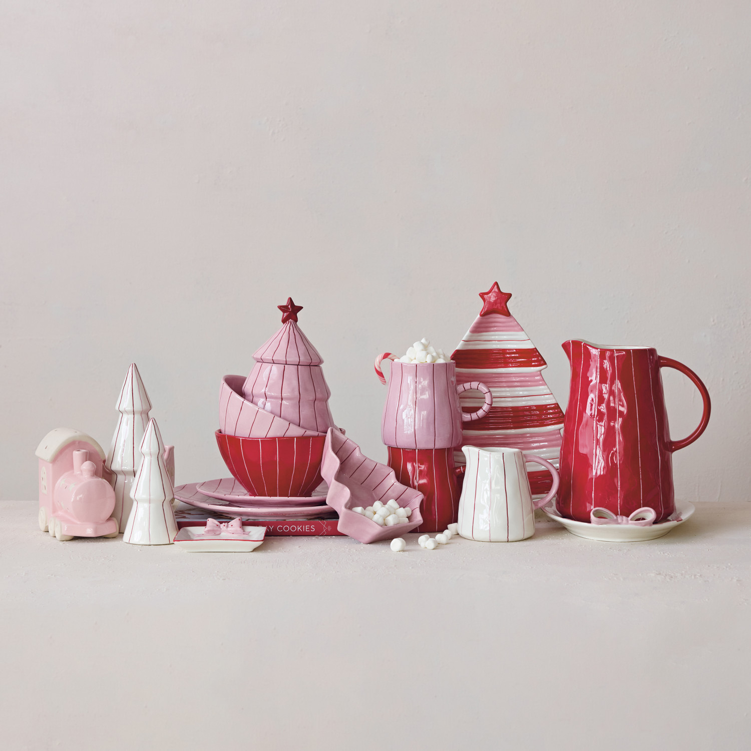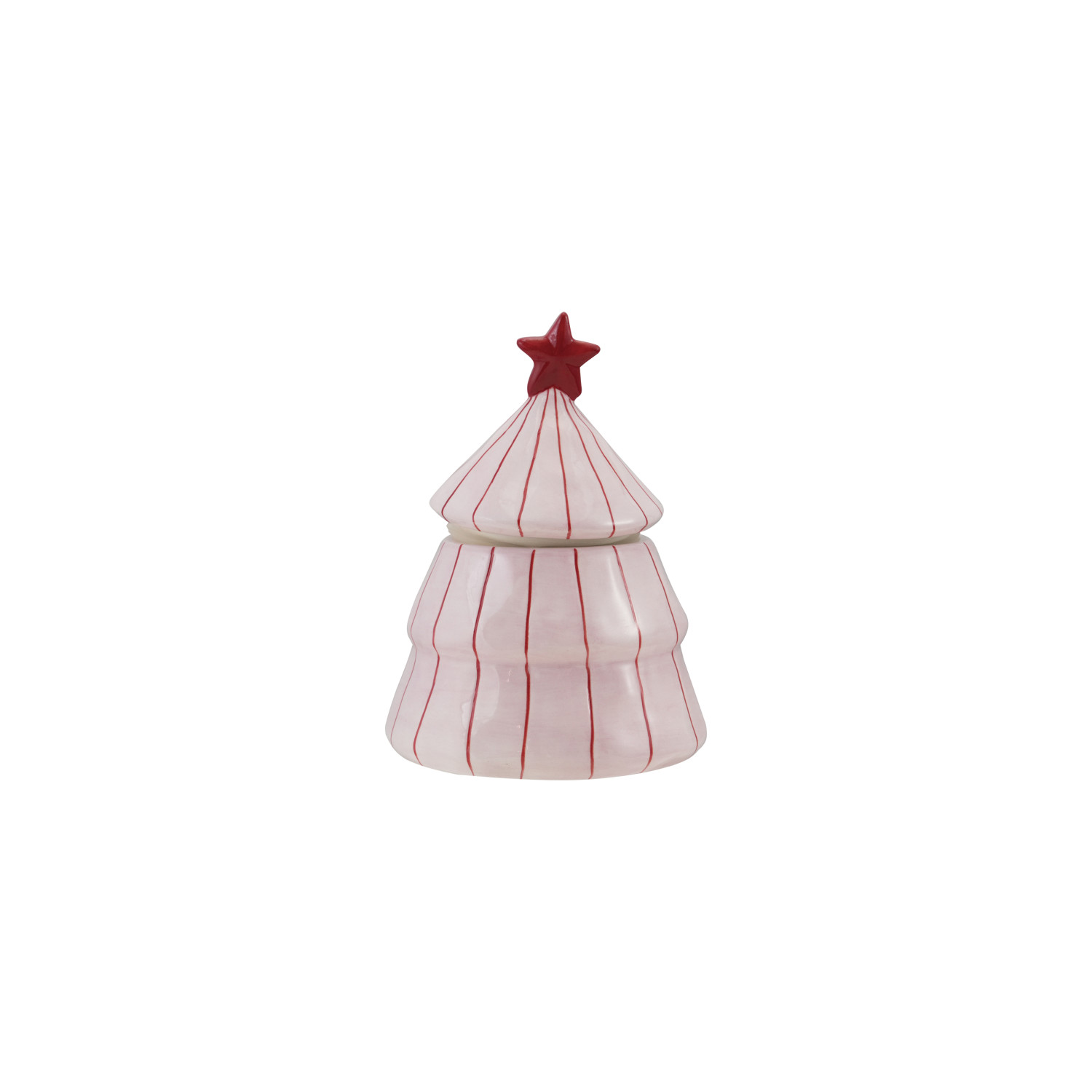 Catalog Name: 4-3/4" Round x 6-1/4"H Hand-Painted Stoneware Striped Tree Shaped Canister w/ Star, Pink & Red