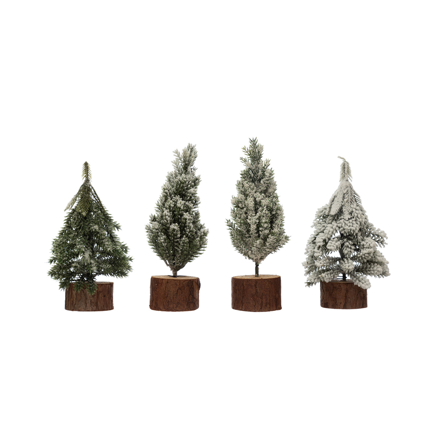 Catalog Name: 5-3/4"H - 6-3/4"H Faux Pine Tree w/ Wood Slice Base, Snow Finish, 4 Styles