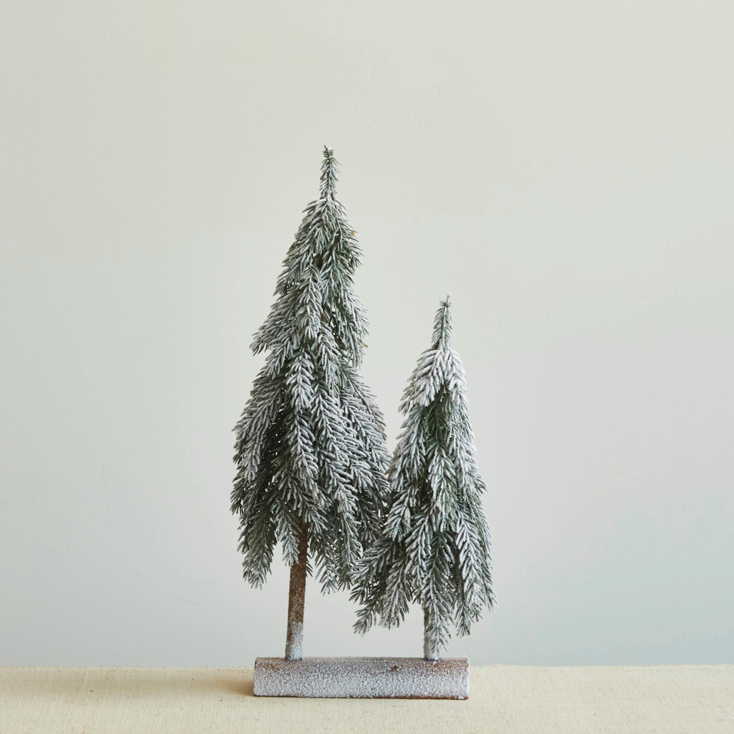 Faux Evergreen Trees w/ Wood Base, Snow Finish, Green