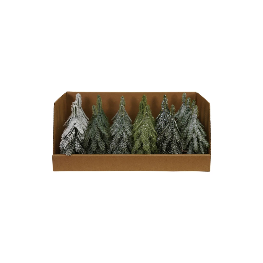 Catalog Name: 2" Round x 4-1/4"H Faux Evergreen Trees w/ Natural Wood Slice Bases, Snow/Ice Finish, Boxed Set of 24