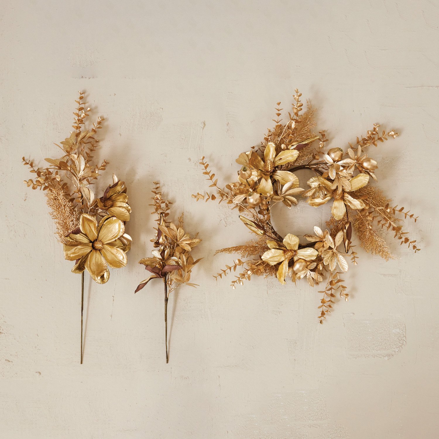 Catalog Name: 24"H Faux Mixed Botanicals Spray w/ Magnolia Leaves & Berries, Gold Finish