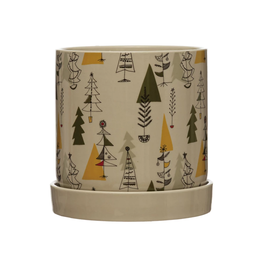 Catalog Name: 6" Round x 6"H Stoneware Planter with Saucer and Christmas Tree Print, Multi Color, Set of 2 (Holds 5" Pot)