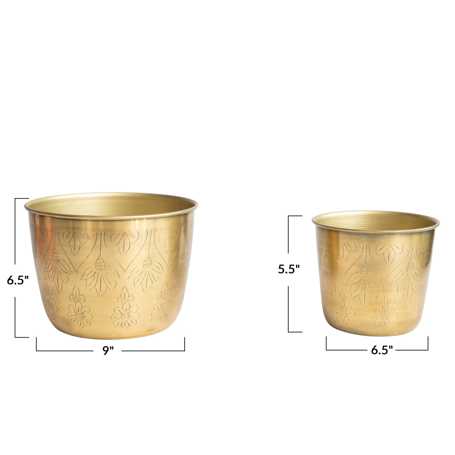 Catalog Name: 9" Round x 6-1/2"H & 6-1/2" Round x 5-1/2"H Etched Metal Planters, Antique Gold Finish, Set of 2 (Holds 8" & 5" Pots)