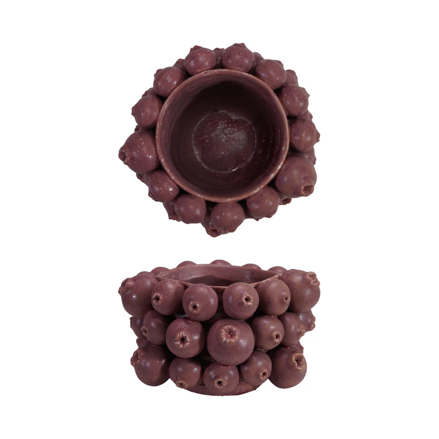 Catalog Name: 8" Round x 5-1/4"H Stoneware Planter w/ 3D Pomegranates, Reactive Glaze, Berry Color (Holds 3" Pot) (Each One Will Vary)