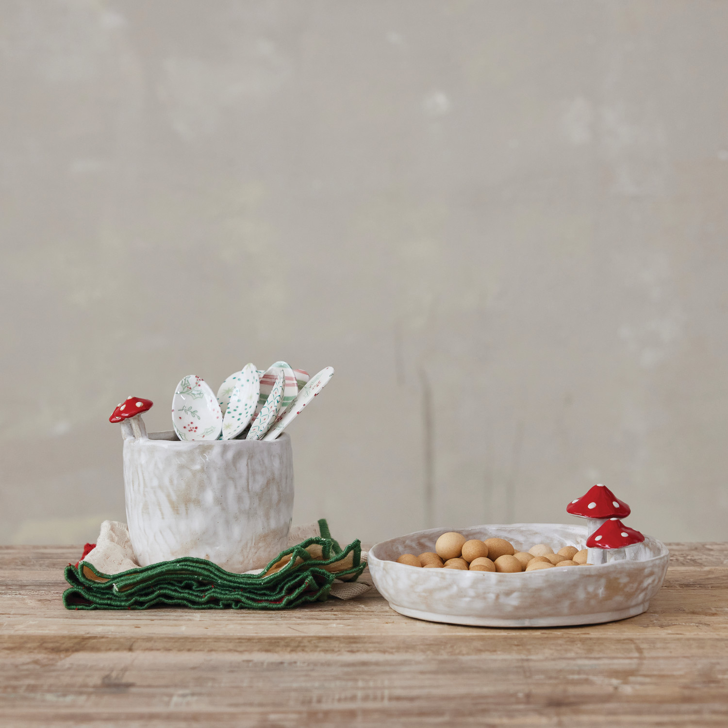 Catalog Name: 4" Round x 4"H Hand-Painted Stoneware Planter w/ 3D Mushrooms, White & Red (Holds 3" Pot)