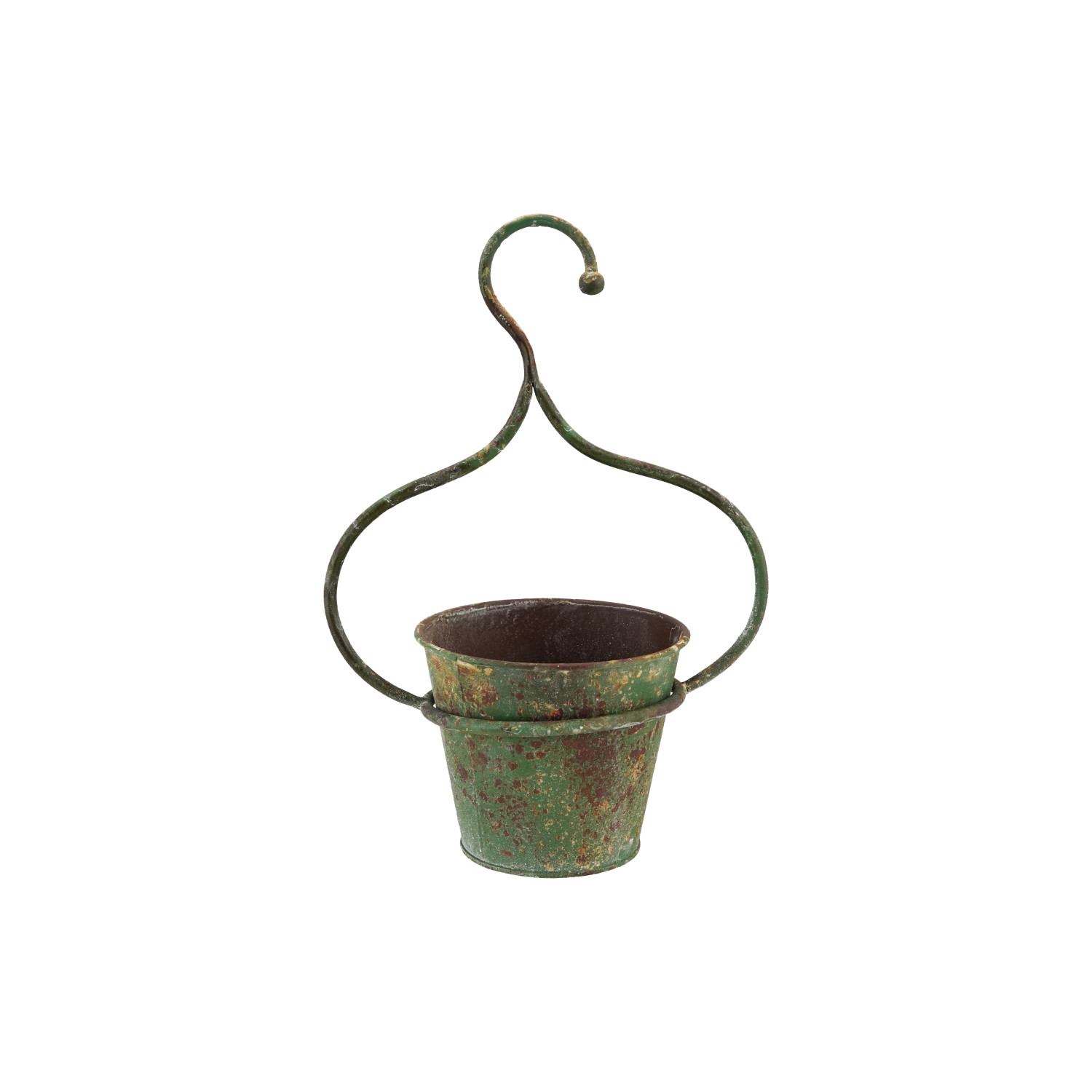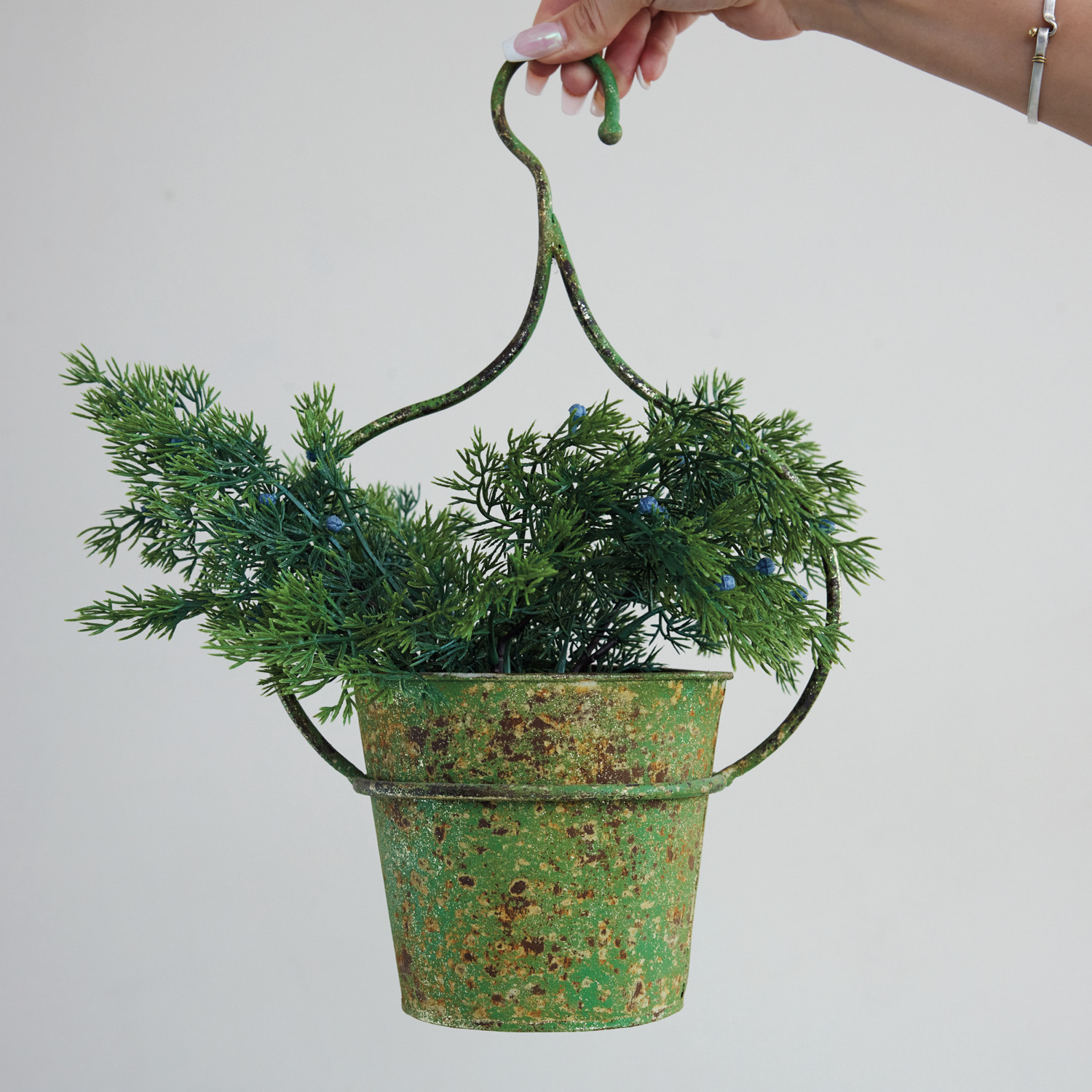 Catalog Name: 8"L x 5"W x 11-1/2"H Hanging Metal Planter w/ Gold Glitter, Distressed Finish, Green (Holds 3" Pot)