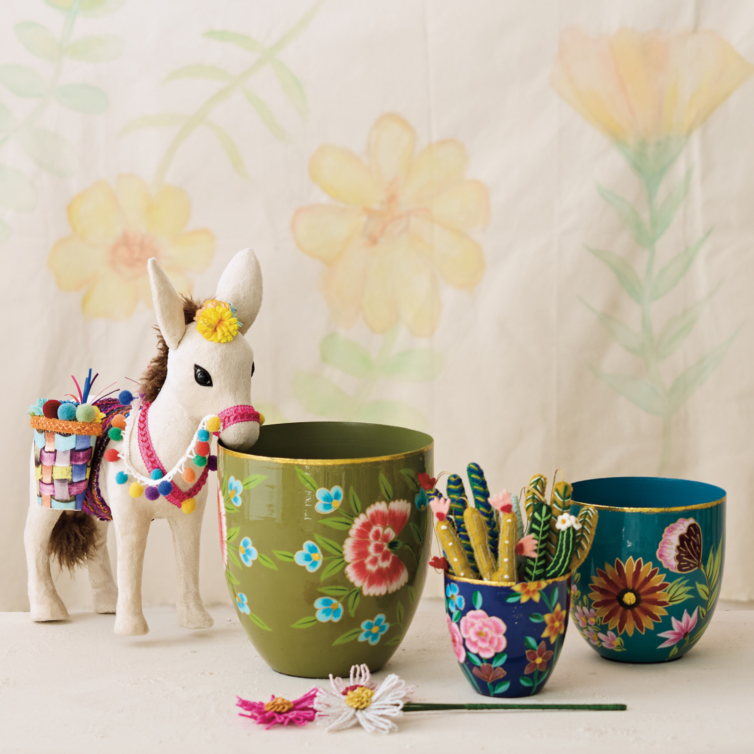 Hand-Painted Enameled Metal Planters with Flowers & Gold Rims, Set of 3