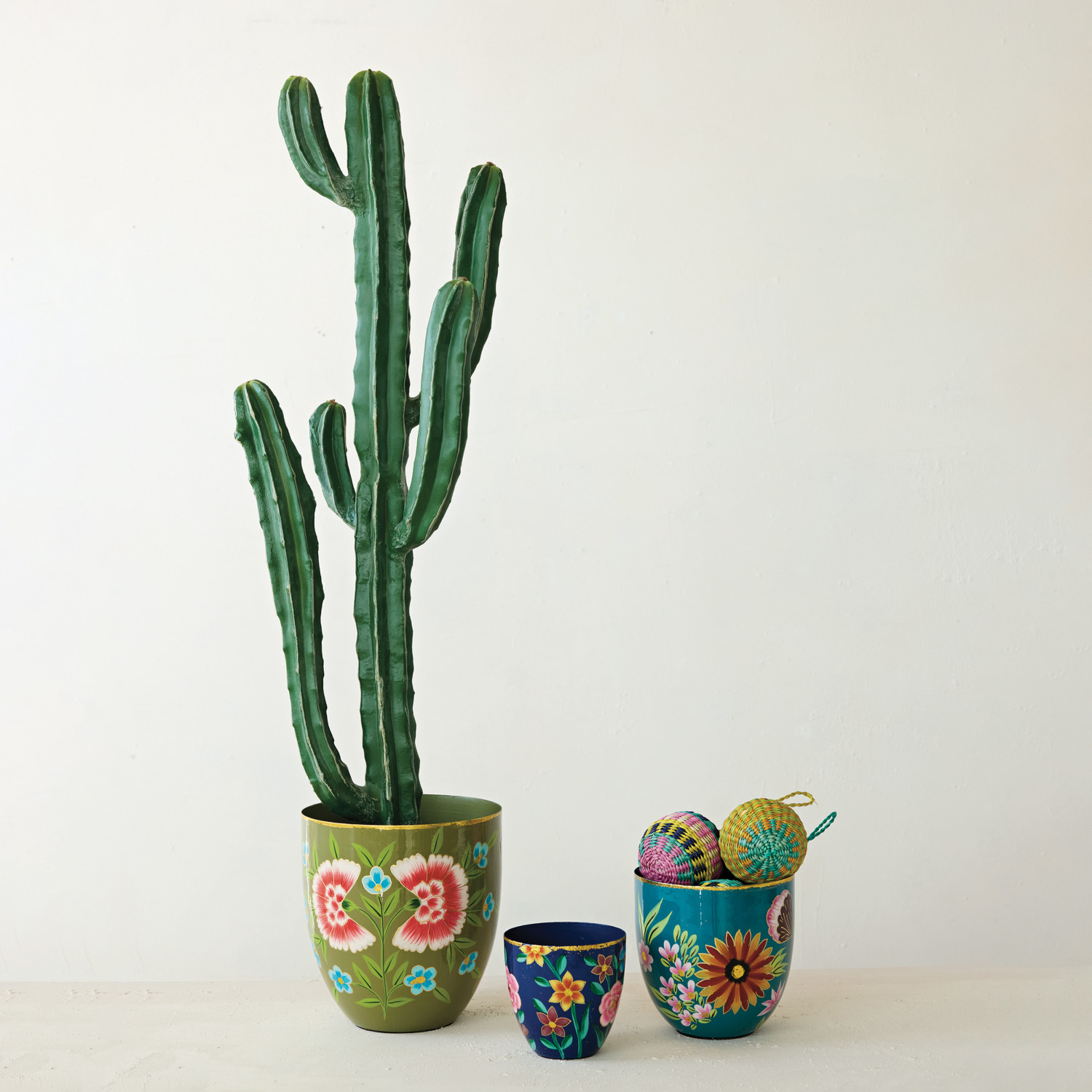 Catalog Name: 8-1/2" Round x 9-1/4"H, 6-3/4" Round x 6-1/2"H & 4-3/4" Round x 4-3/4"H Hand-Painted Enameled Metal Planters w/ Flowers & Gold Rims, Multi Color, Set of 3