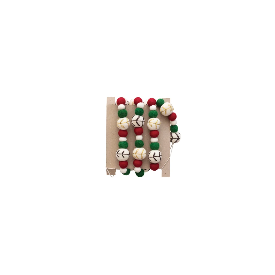 Catalog Name: 72"L x 1-1/2"H Handmade Wool Felt Ball Garland w/ Embroidery, Natural, Red & Green