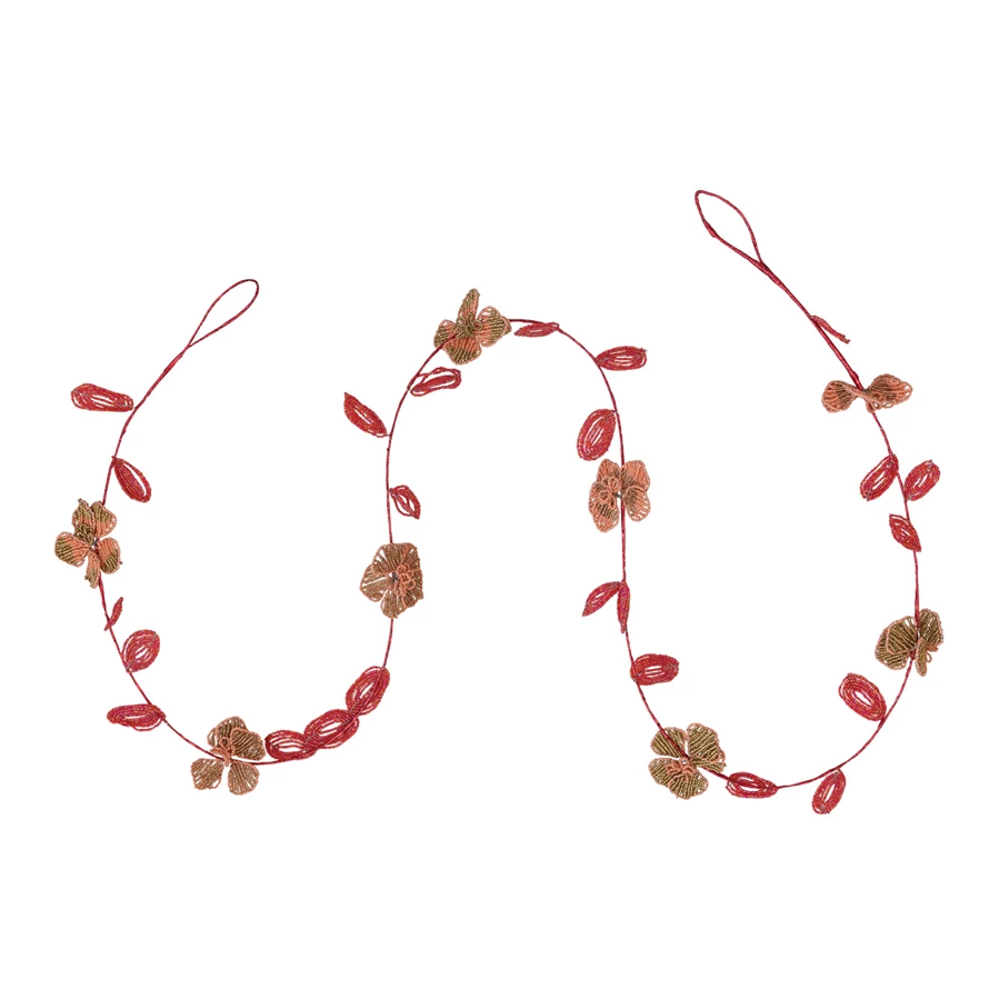 This elegant garland features intricately beaded leaves and flowers strung together with metal wire. Add a touch of festive whimsy to any space with our enchanting collection of garlands, including stunning glass, sleek metal, and delightful mixed-material options, all expertly crafted to create a merry and bright atmosphere.
