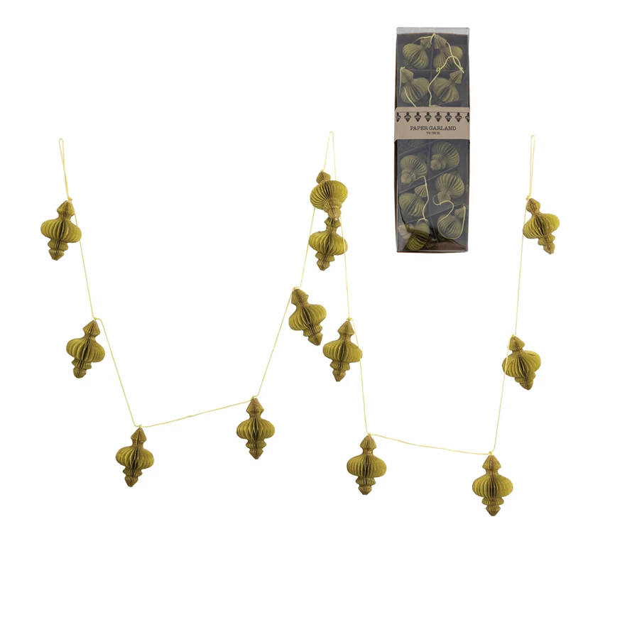 This festive garland features intricately handcrafted recycled paper honeycomb finial shapes finished with gold glitter. Add a touch of festive whimsy to any space with our enchanting collection of garlands, including stunning glass, sleek metal, and delightful mixed-material options, all expertly crafted to create a merry and bright atmosphere.